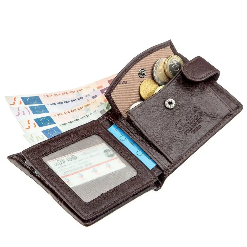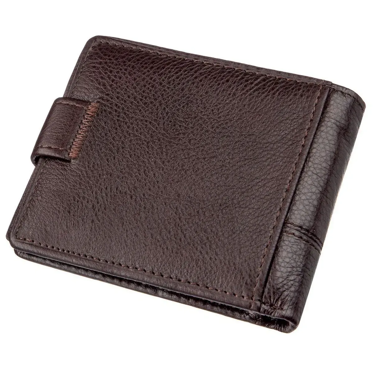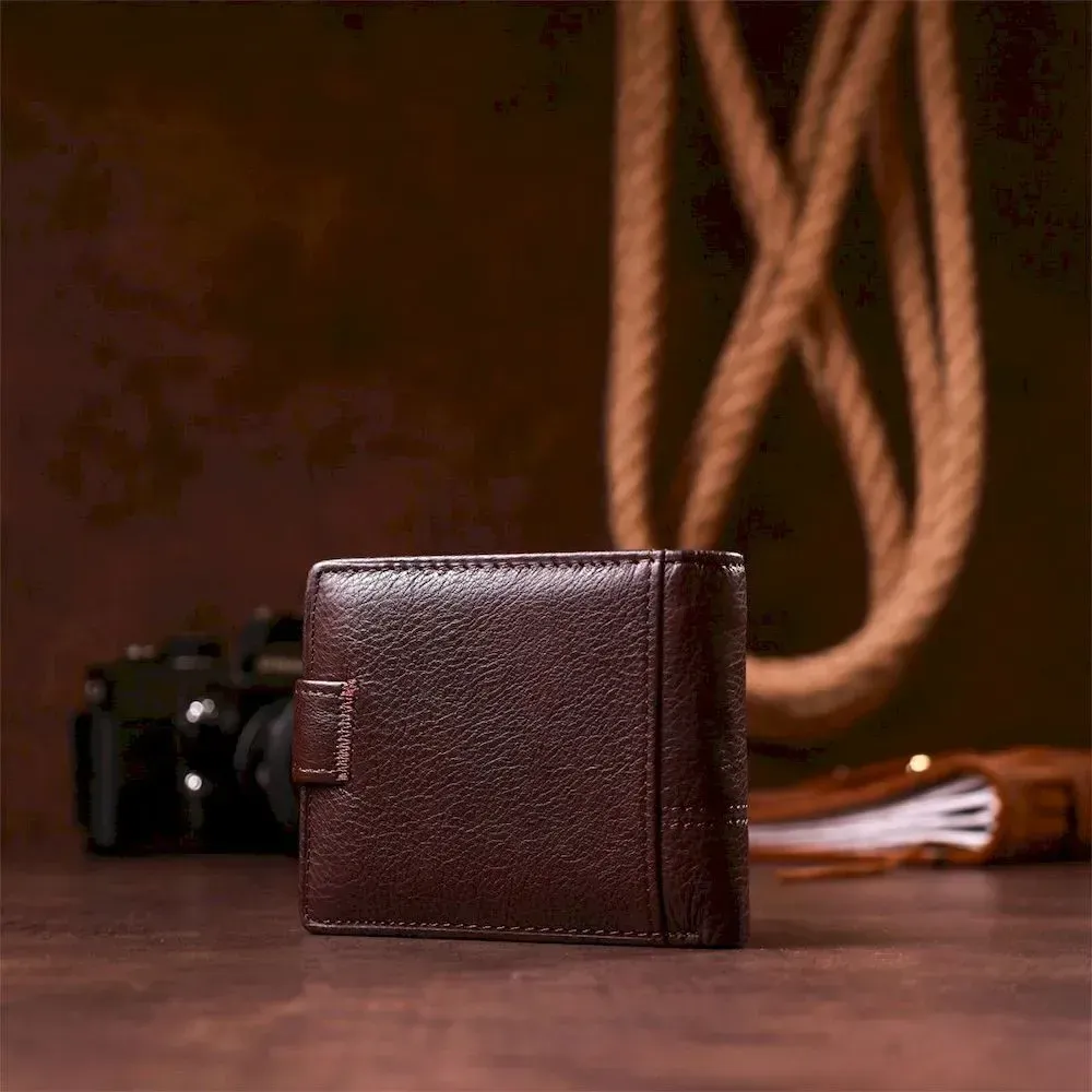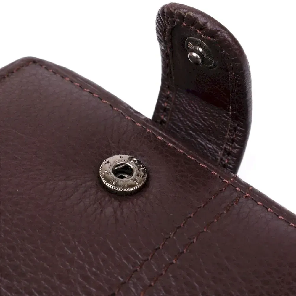 Класичний гаманець із натуральної шкіри темно-коричневого кольору. Аксесуар виконаний у зернистій шкірі. М'який і приємний на дотик і доповнений всім необхідним функціоналом. Усередині гаманця є спеціальний внутрішній вкладиш під прозорою плівкою для посвідчення водія або карток. На зовнішньому боці металевий логотип бренду. Портмоне закривається на хлястику з кнопкою. Легко поміститься в невелику сумку або кишеню штанів. У комплекті йде картонна жовта коробка.