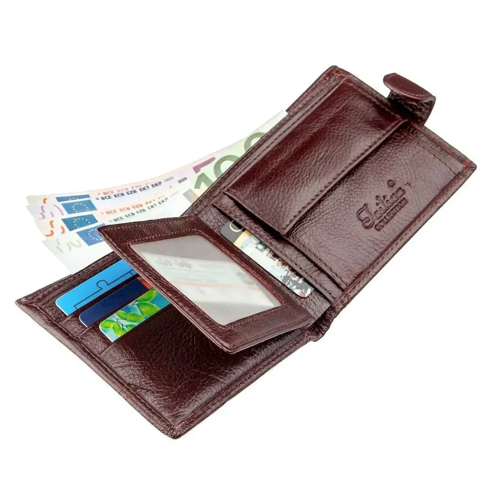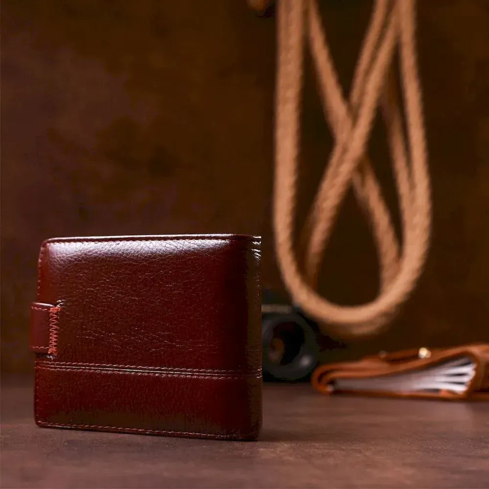 Класичний компактний чоловічий гаманець без зайвих деталей. Аксесуар має необхідний функціонал будь-якого чоловіка. Закривається гаманець на шкіряний хлястик із кнопкою. Матеріал виконання – натуральна шкіра найвищої якості. У комплекті йде картонна коробка жовтого кольору.