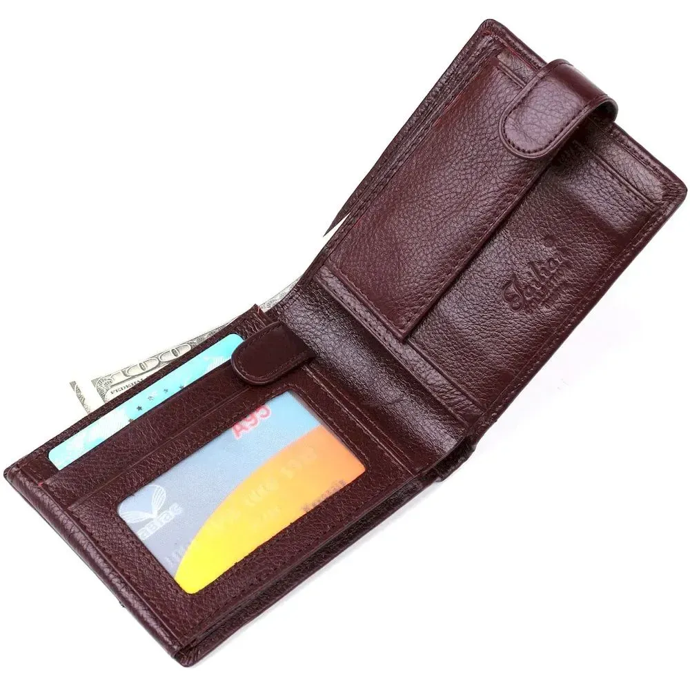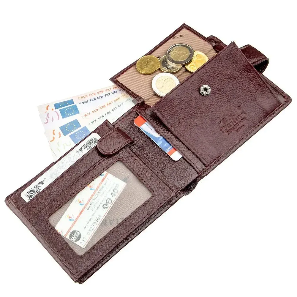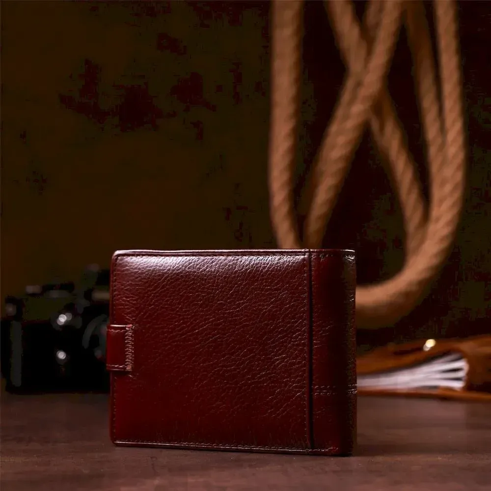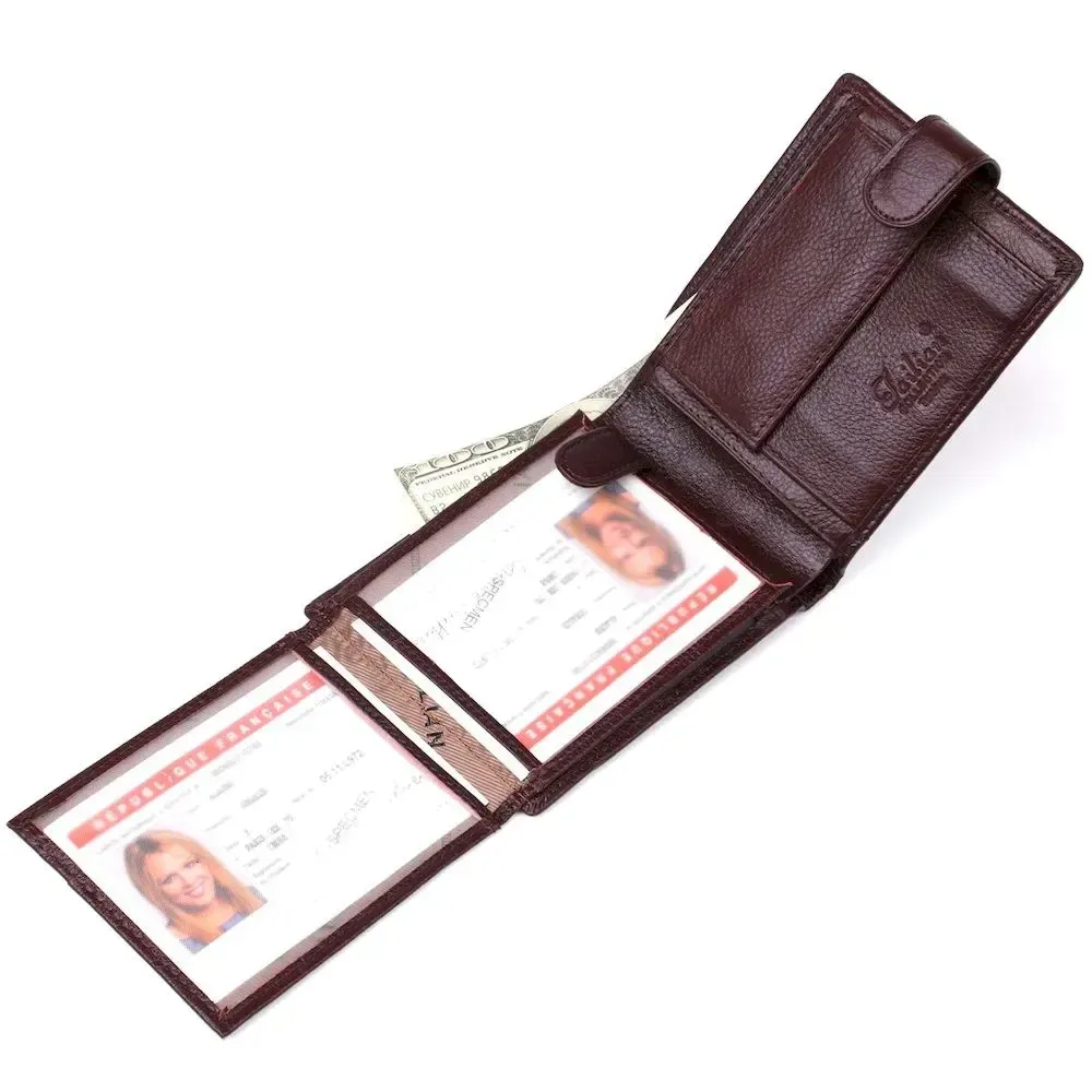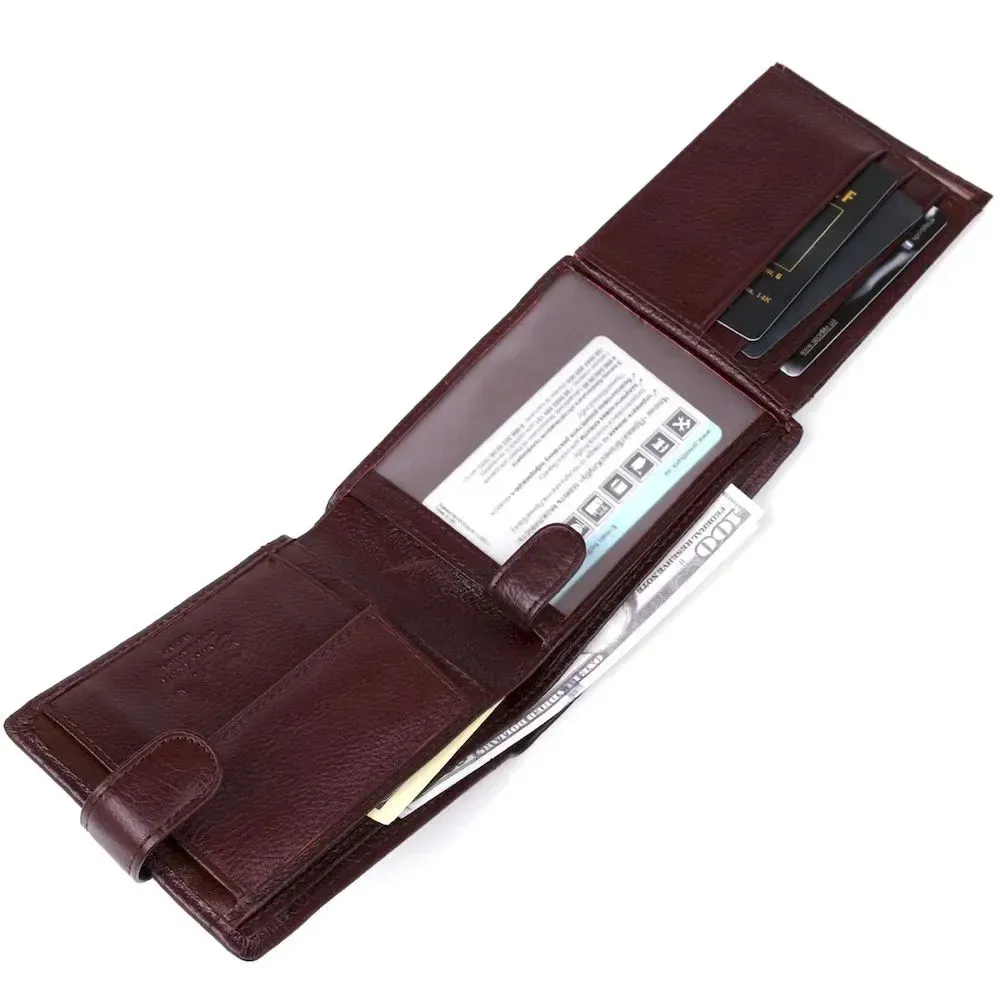 Містка модель класичного гаманця з більшим функціоналом. У гаманці є кілька відділень під плівкою для прав або ID картки чи фотографії. Закривається гаманець на шкіряний хлястик на кнопці. Комплект осередків для карток також закріплюється хлястиком із кнопкою. На зовнішній стороні аксесуара рівний рядок та металевий логотип бренду. Гаманець буде чудовим подарунком для близької людини.