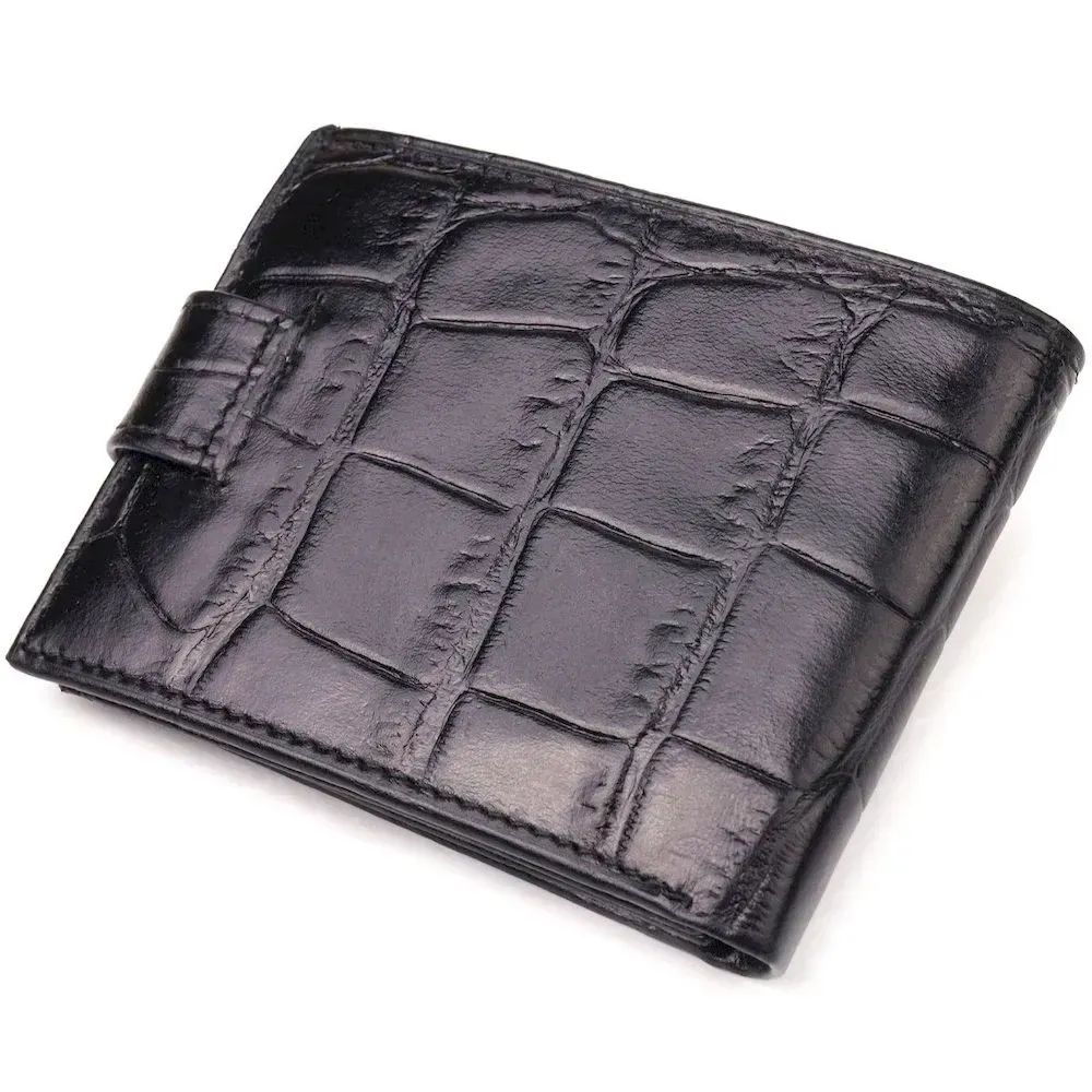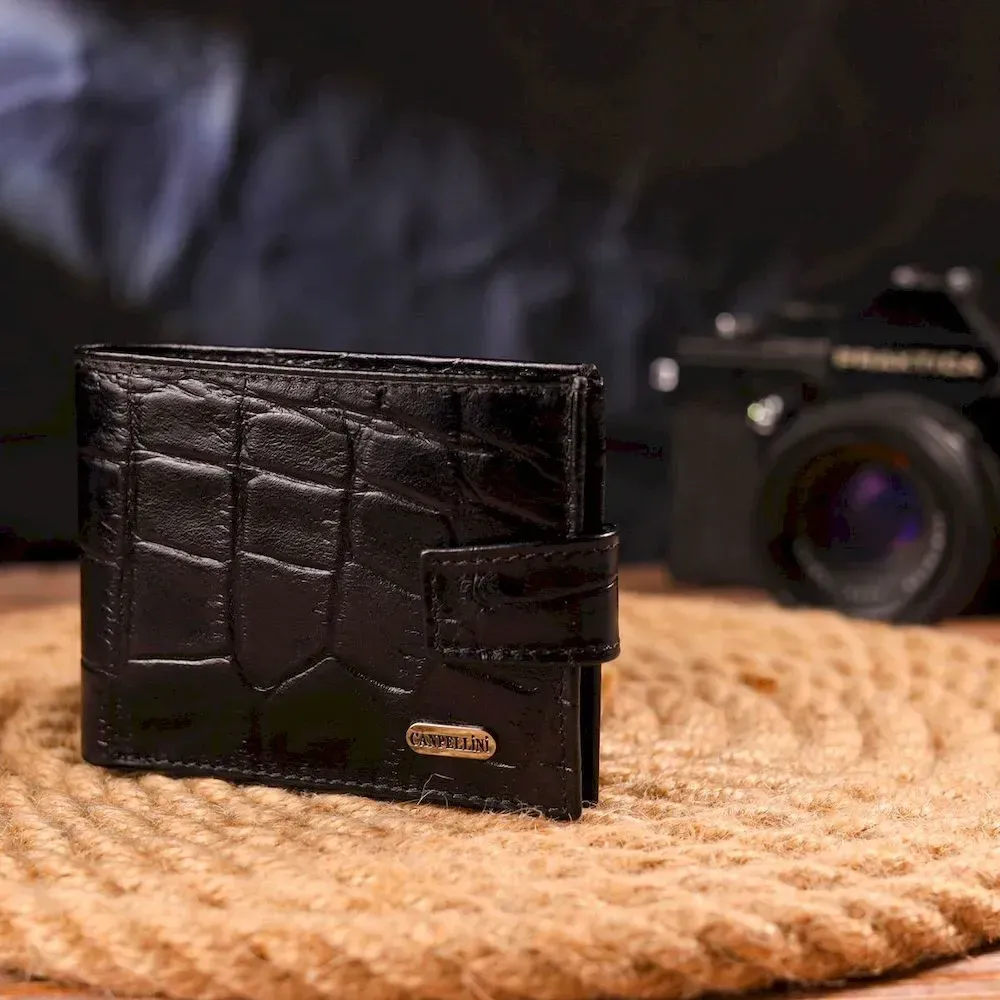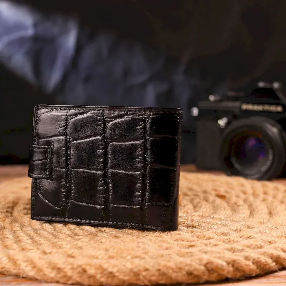 Практичний чоловічий портмоне, з натуральної фактурної шкіри, з тисненням під крокодила, у насиченому чорному кольорі. Аксесуар має одне основне відділення з перегородкою, в якому розміщуються купюри всіх номіналів, дванадцять кишень для карток, чотири з яких під сіточкою. Закривається аксесуар хлястиком на кнопку. Колір фурнітури – срібло. Ви легко зможете помістити його в кишеню штанів чи маленьку сумку. Запакований гаманець картонну коробку. Шкіряний гаманець є чудовим подарунком для рідних та близьких людей.