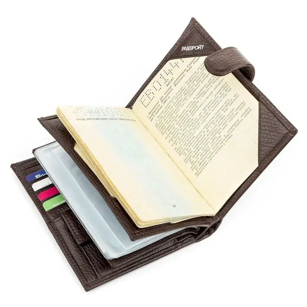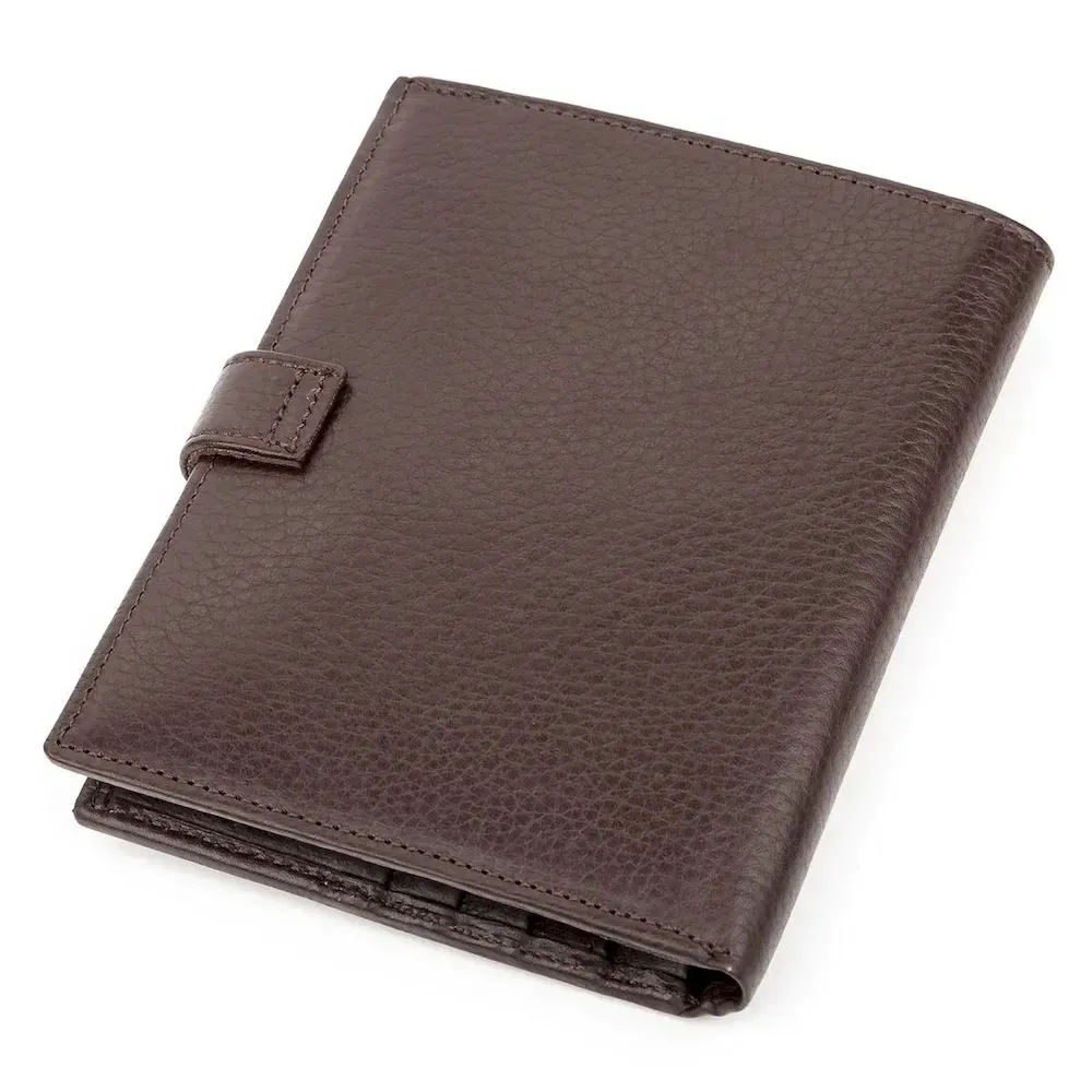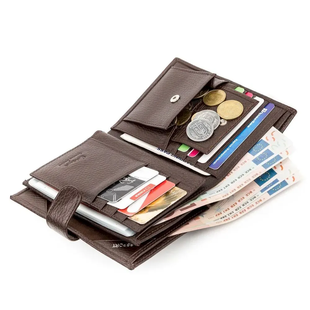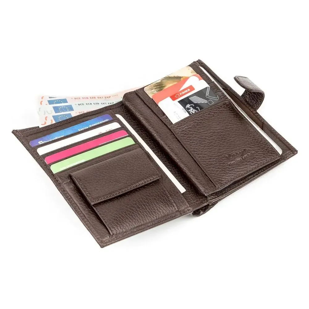 Місткий чоловічий гаманець коричневого кольору. Аксесуар виконаний з натуральної високоякісної зернистої шкіри, преміум класу, приємної на дотик. Виріб упакований у фірмову коробочку. Якість аксесуара на високому рівні, так що прослужить своєму власнику тривалий час.