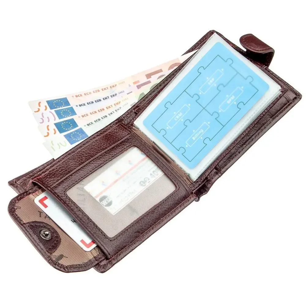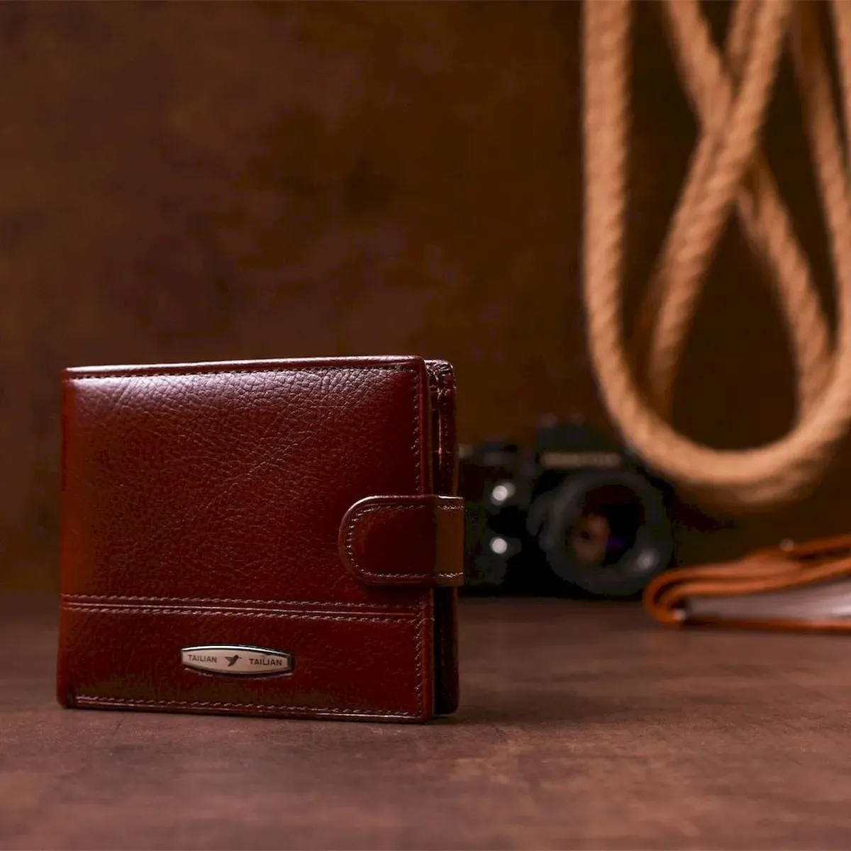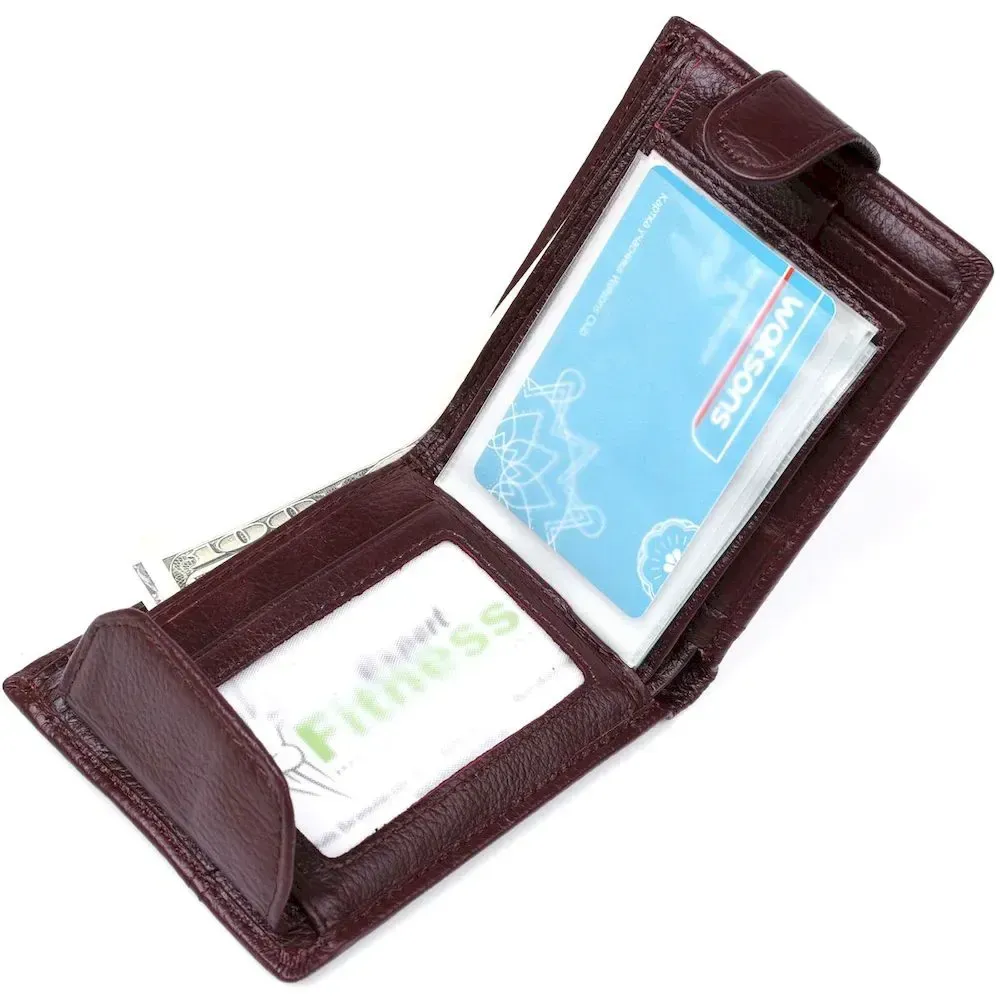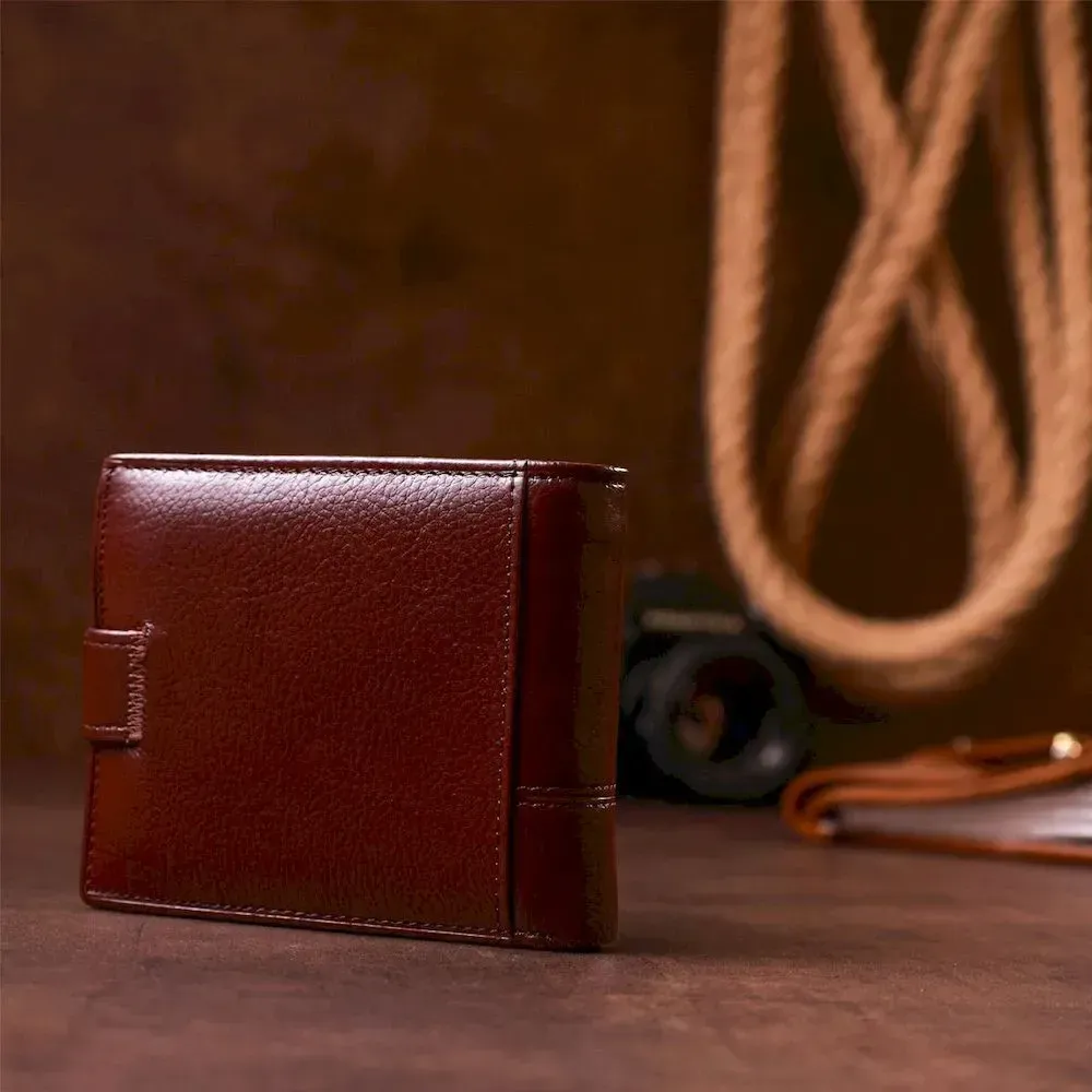 Модель гаманця – класика коричневого кольору. Відмінною особливістю даного гаманця є те, що в нього вбудована візитниця, яка закривається на хлястик з кнопкою. Усередині гаманець виконаний із натуральної шкіри у поєднанні з міцним текстилем. Закривається гаманець на хлястику з кнопкою. У комплекті йде картонна коробка жовтого кольору.