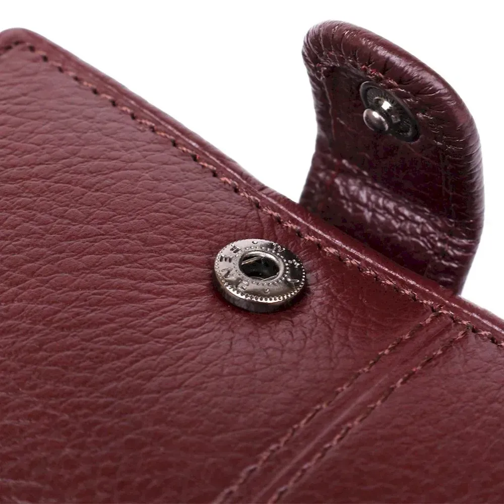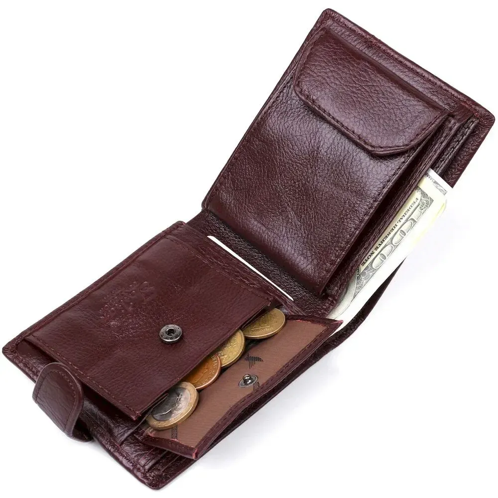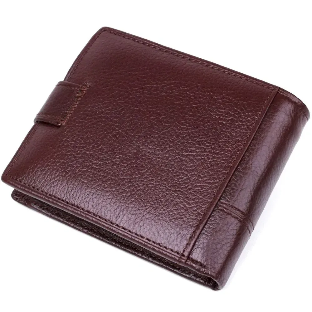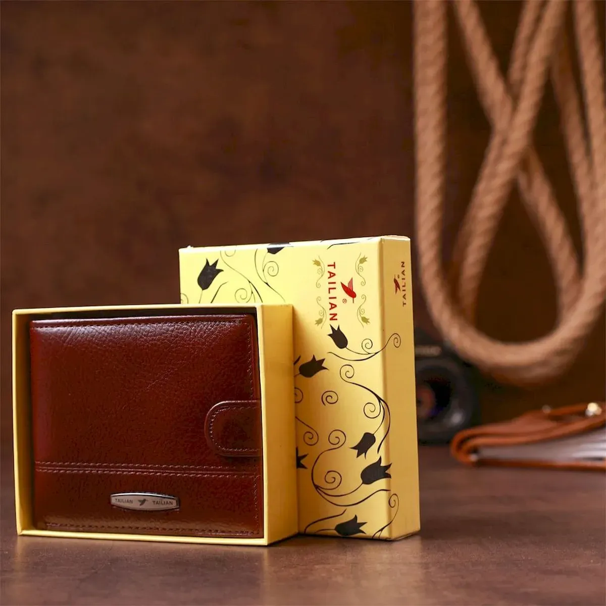 Модель гаманця – класика коричневого кольору. Відмінною особливістю даного гаманця є те, що в нього вбудована візитниця, яка закривається на хлястик з кнопкою. Усередині гаманець виконаний із натуральної шкіри у поєднанні з міцним текстилем. Закривається гаманець на хлястику з кнопкою. У комплекті йде картонна коробка жовтого кольору.