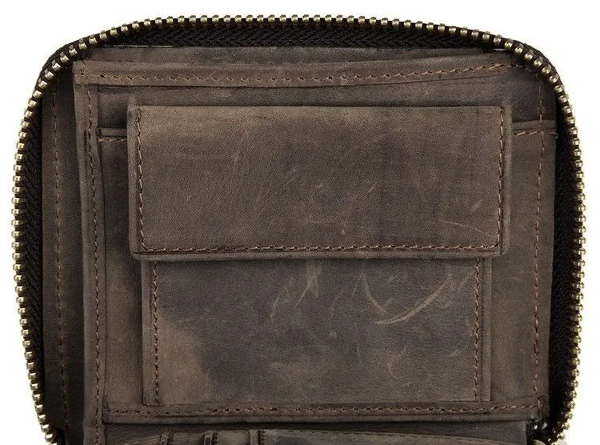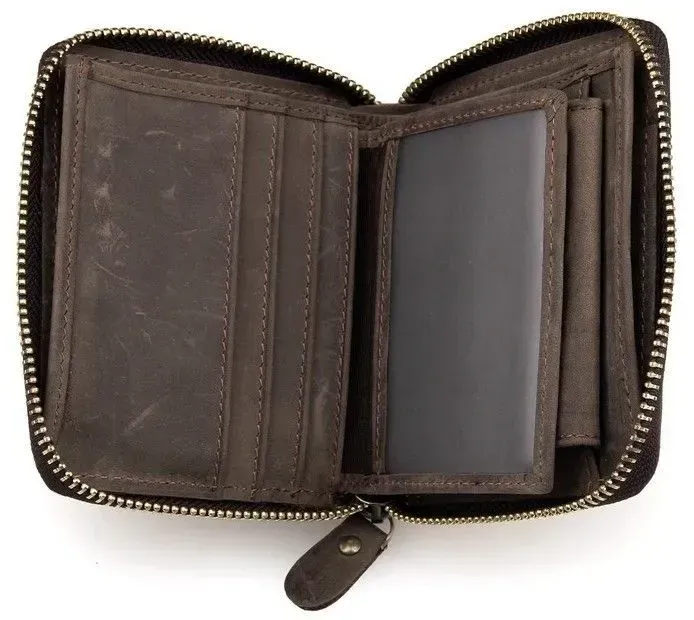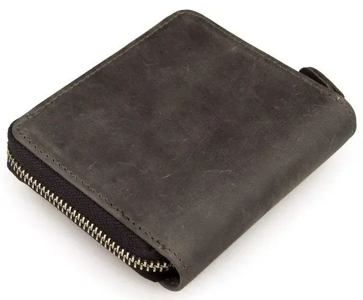 Чудовий гаманець із високоякісної вінтажної шкіри. Гаманець має досить компактні розміри, але, незважаючи на це, він досить місткий і функціональний. Аксесуар закривається на блискавку. Колір фурнітури: латунь. Цей купюрник може використовуватися як чоловіками, так і жінками. Гаманець упакований в текстильний чохол. >Всередині: