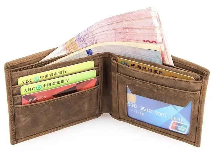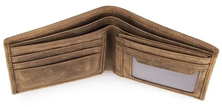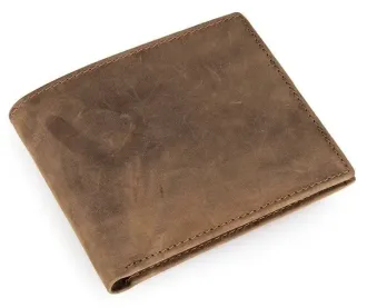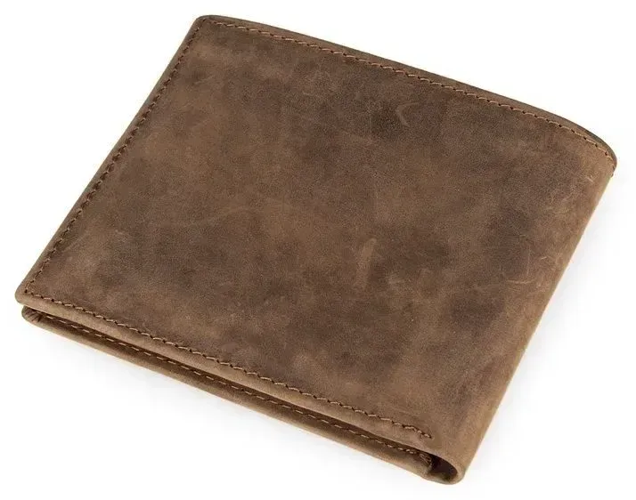 Сучасний чоловічий гаманець коричневого кольору. Аксесуар виконаний з вінтажної шкіри, яка дуже популярна цього сезону. Така шкіра відрізняється неоднорідною фактурою та потертостями, які надають їй унікального та неповторного стилю. Гаманець надійно прошитий коричневою ниткою. Аксесуар постачається в текстильному мішочку для пилу білого кольору.
