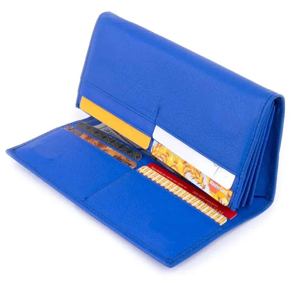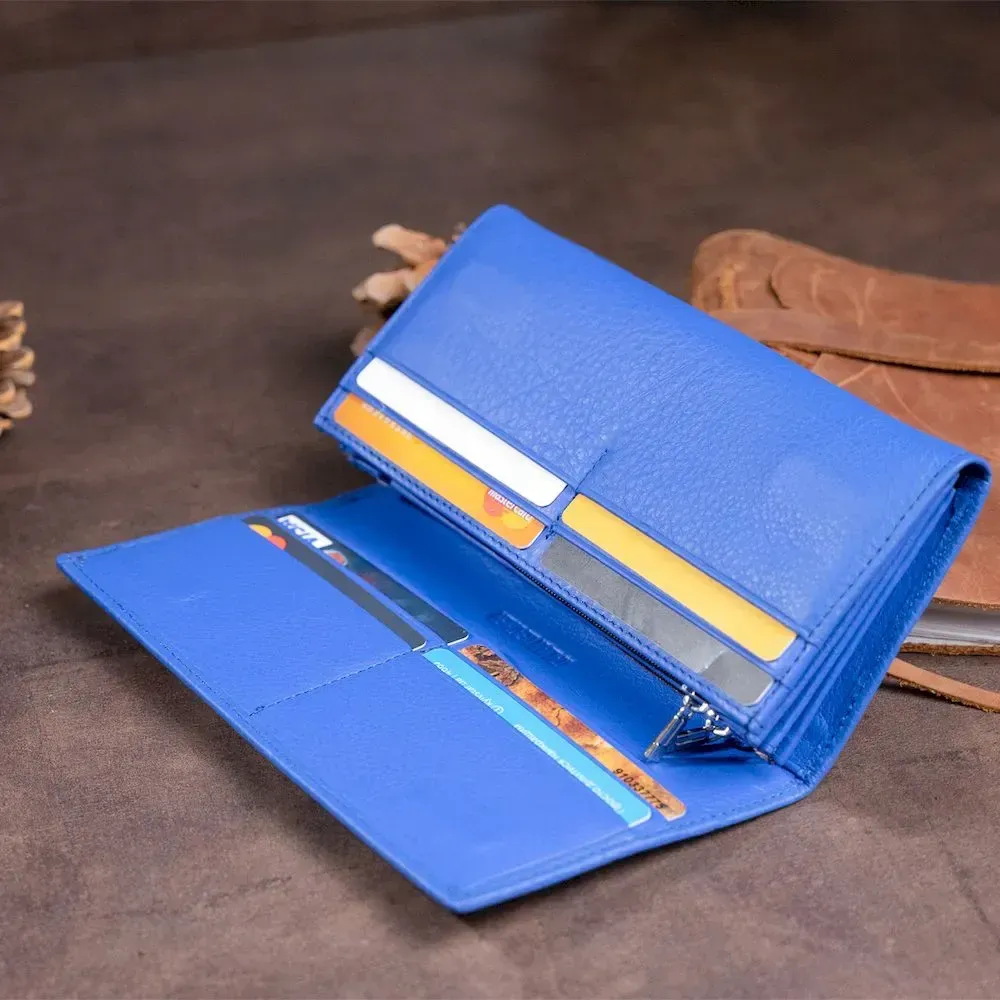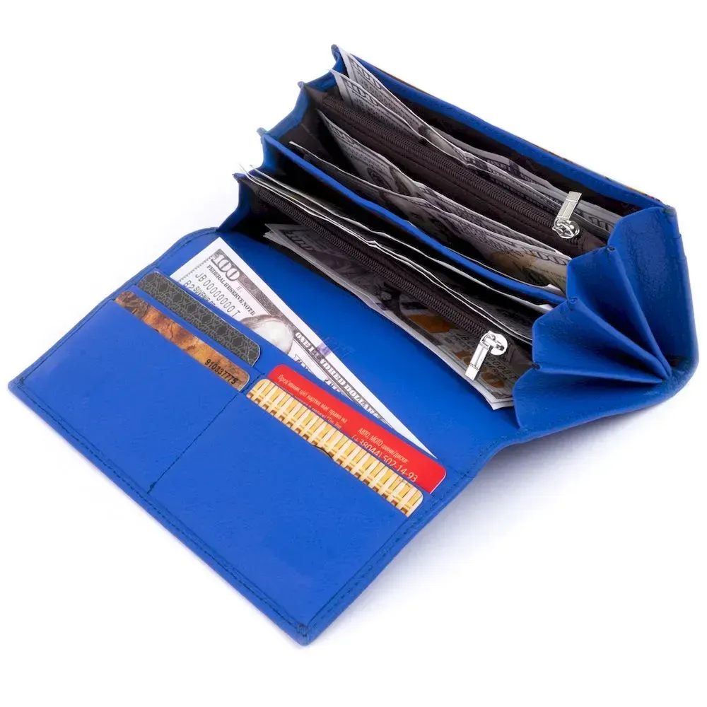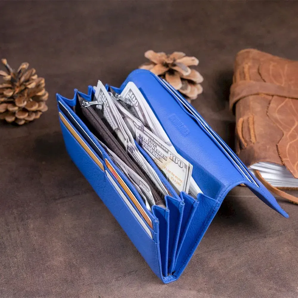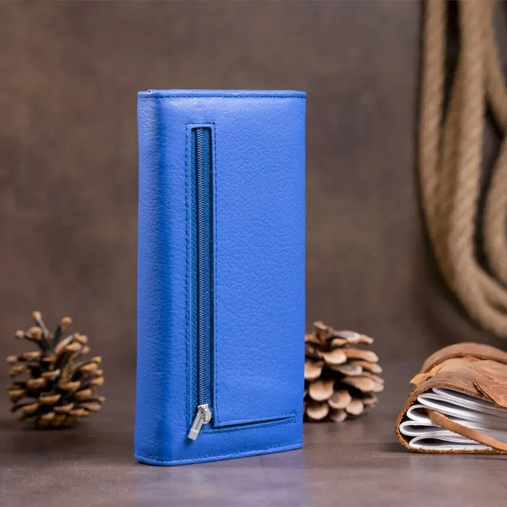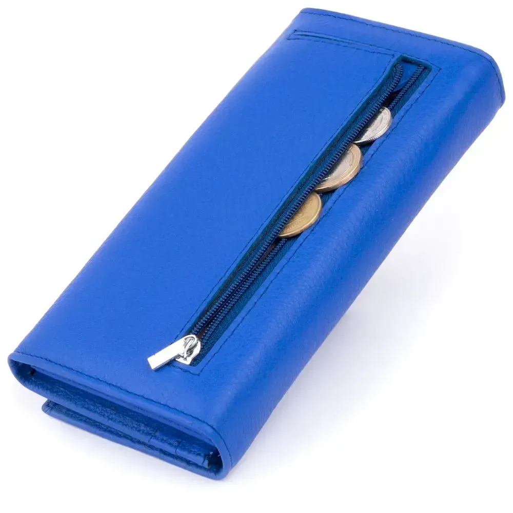 Горизонтальний гаманець насиченого синього кольору на 4 відділення для купюр. Яскравий колір моделі не залишиться поза увагою. Виробництво – фабричний Китай з урахуванням усіх модних тенденцій. Виріб продуманий до дрібниць і виконаний у класичному стилі, але при цьому доповнений кишеньками для вашої зручності. У такий гаманець ви зручно розкладете купюри та кредитки. Закривається гаманець на магніти. На тильній стороні виробу - кишенька на блискавці. Модель підійде для впевнених у собі дівчат і тих, хто любить яскраві аксесуари.