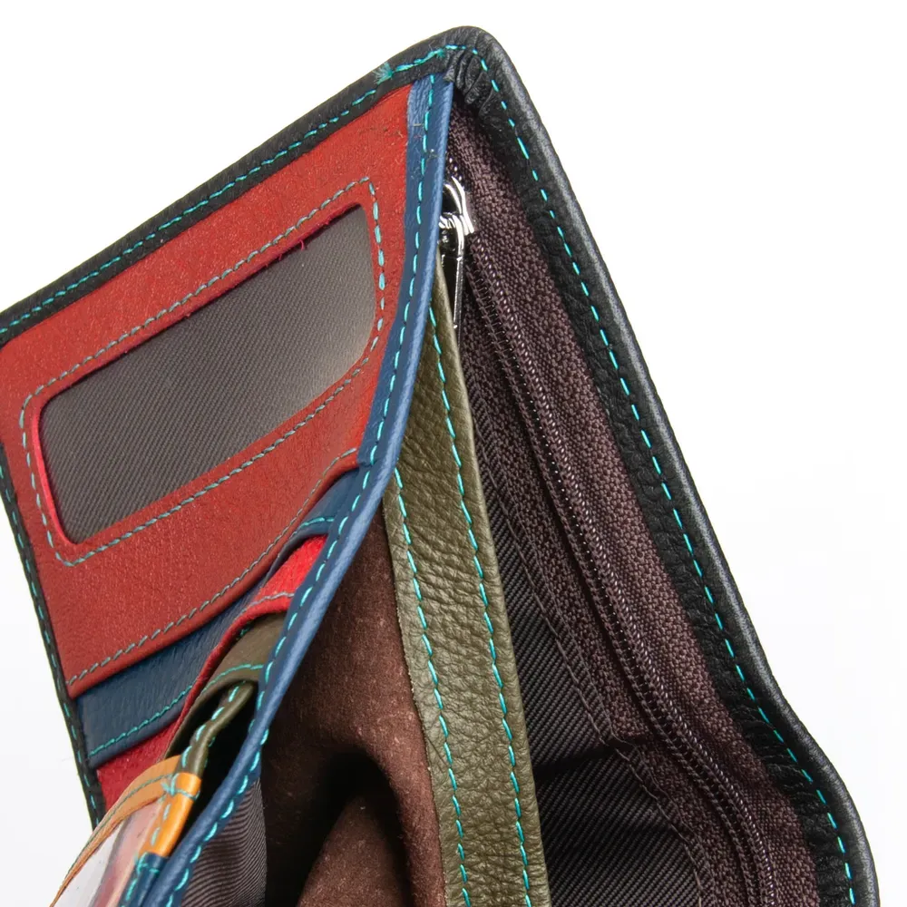 Внутри находятся 2 открытых отделения для банкнот, разделенные кожаной перегородкой и одно отделение на молнии, 12 карманов для визитных карт. Снаружи кошелька на обратной стороне расположен карман-монетница на кнопке.