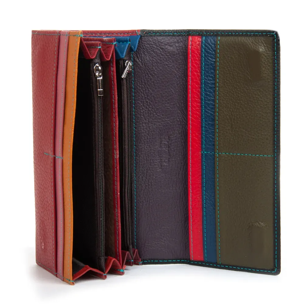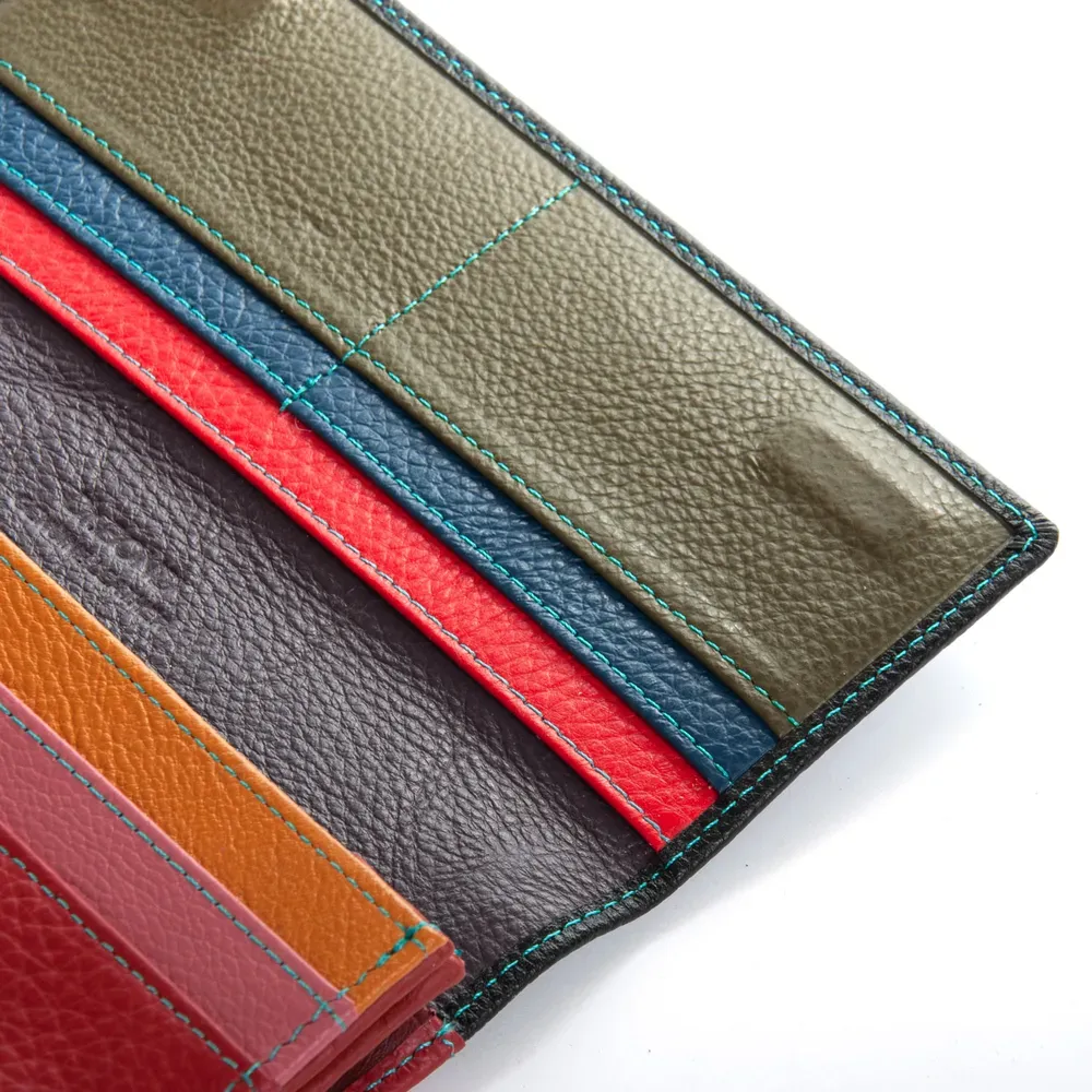 Внутри находятся 4 открытых отделения для банкнот, 2 больших кармана-монетницы на молнии, один большой открытый карман и 8 карманов для визитных карт. Снаружи кошелька на обратной стороне расположен карман на молнии.