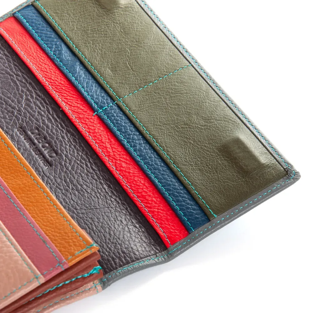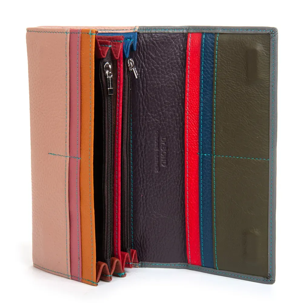 Внутри находятся 4 открытых отделения для банкнот, 2 больших кармана-монетницы на молнии, один большой открытый карман и 8 карманов для визитных карт. Снаружи кошелька на обратной стороне расположен карман на молнии.