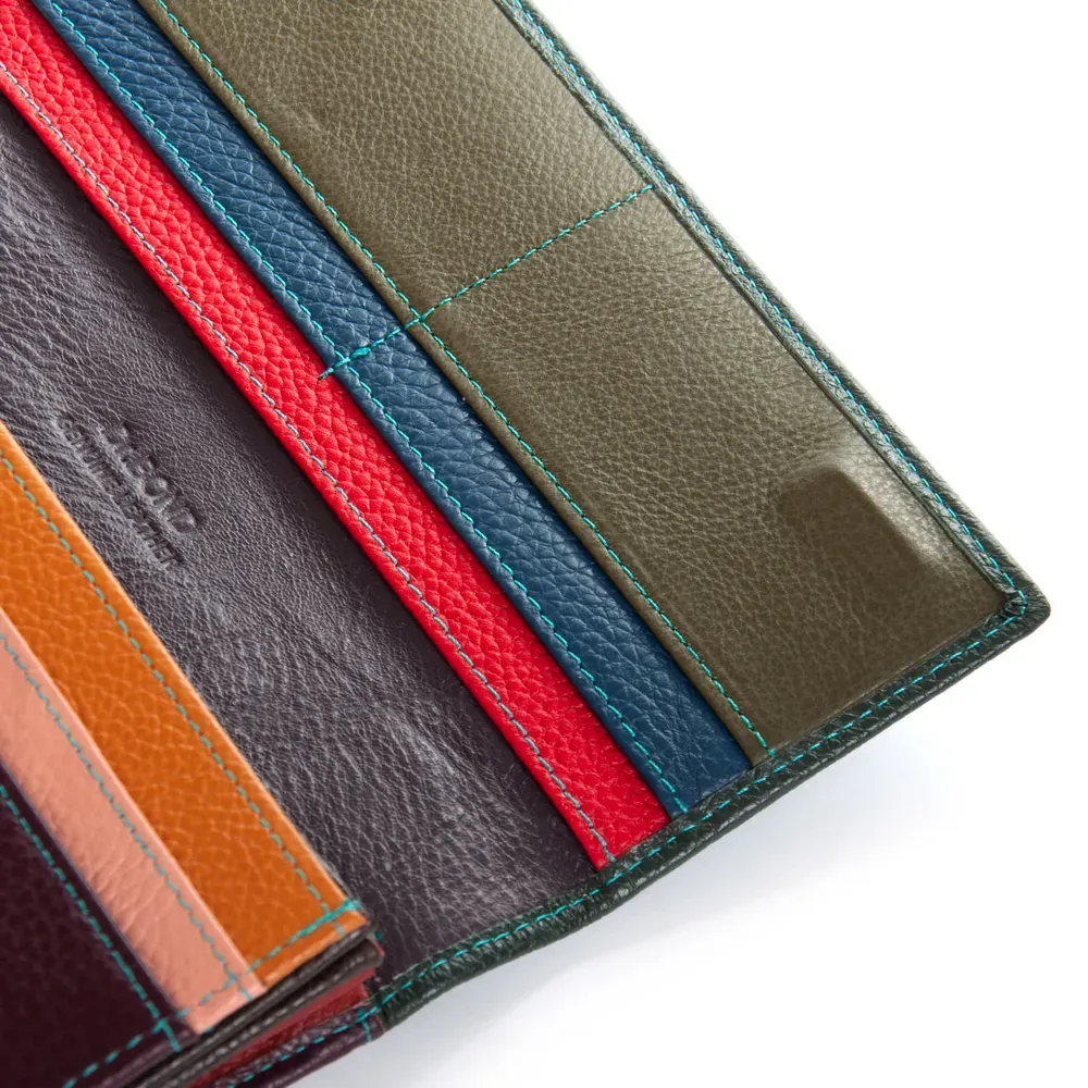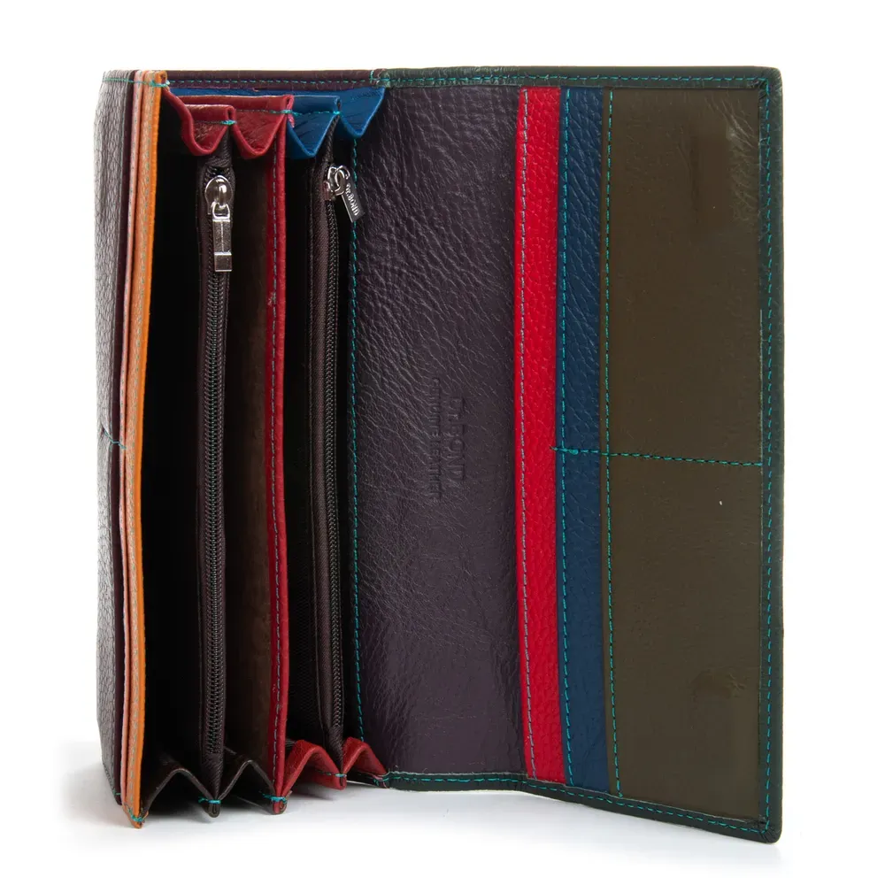 Внутри находятся 4 открытых отделения для банкнот, 2 больших кармана-монетницы на молнии, один большой открытый карман и 8 карманов для визитных карт. Снаружи кошелька на обратной стороне расположен карман на молнии.