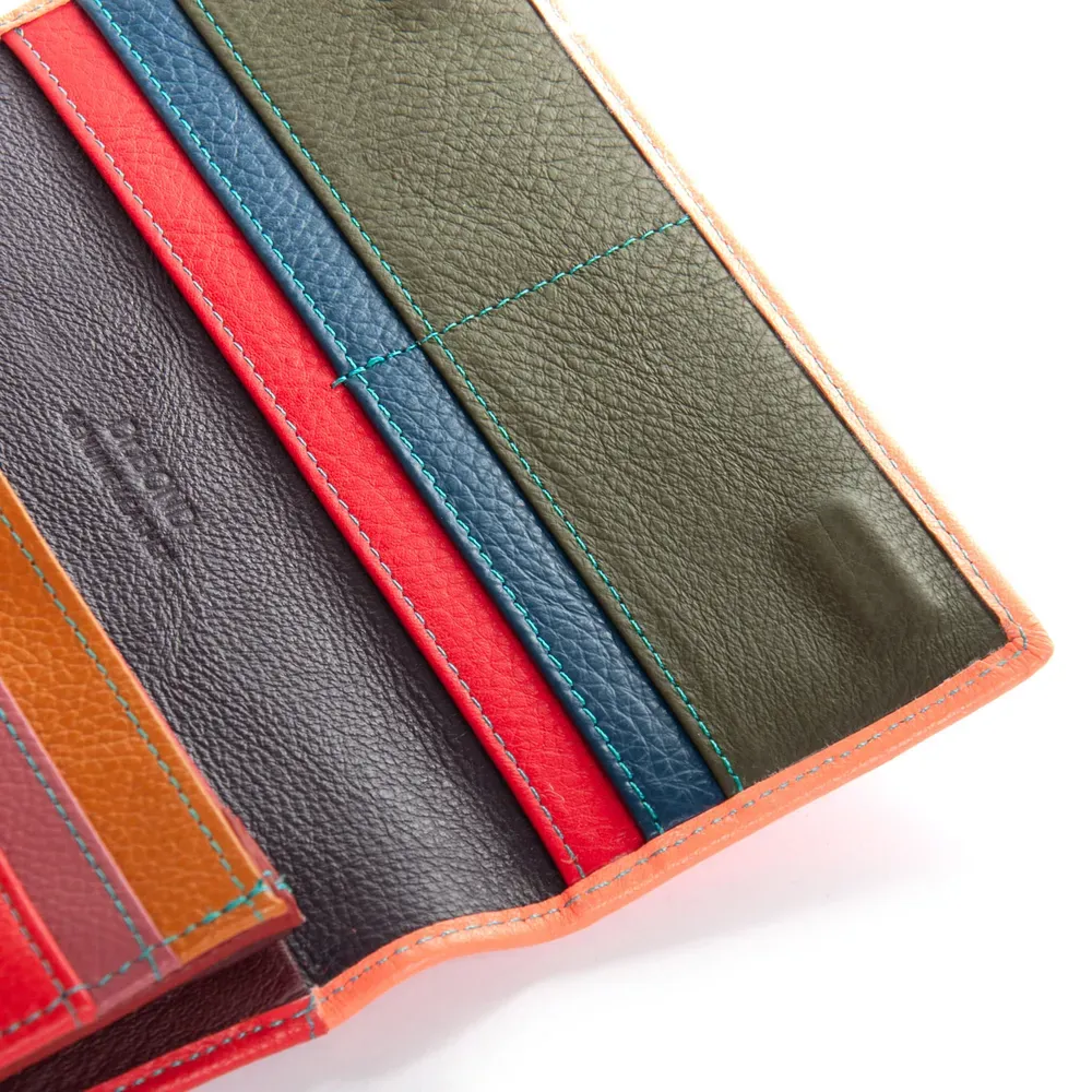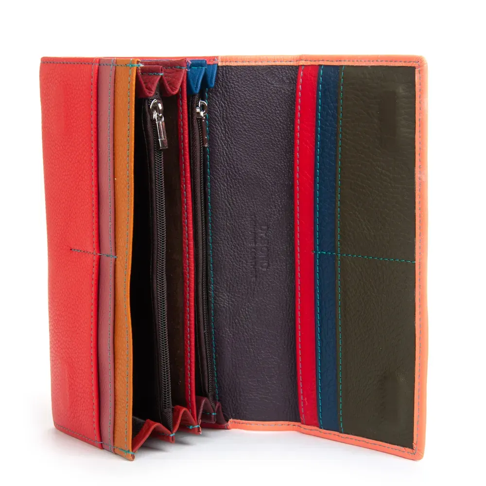 Внутри находятся 4 открытых отделения для банкнот, 2 больших кармана-монетницы на молнии, один большой открытый карман и 8 карманов для визитных карт. Снаружи кошелька на обратной стороне расположен карман на молнии.