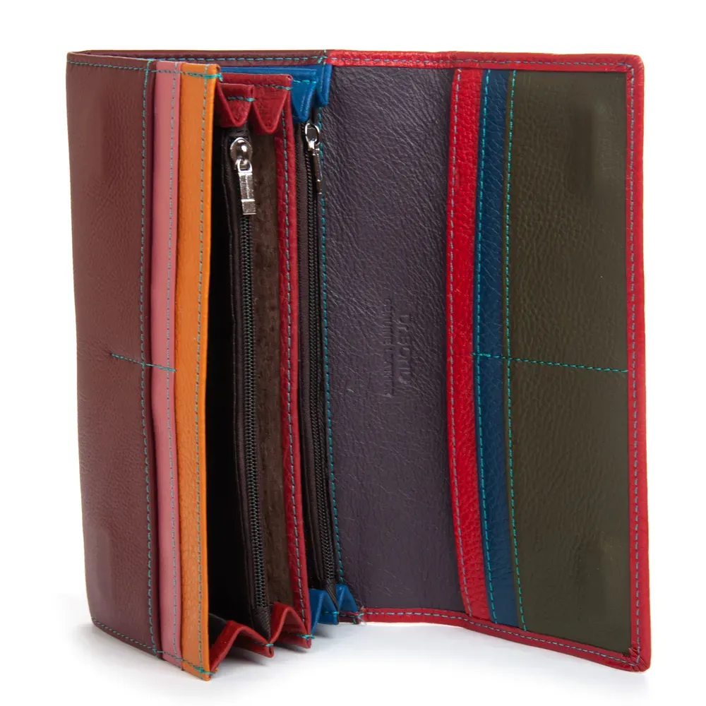 Внутри находятся 4 открытых отделения для банкнот, 2 больших кармана-монетницы на молнии, один большой открытый карман и 8 карманов для визитных карт. Снаружи кошелька на обратной стороне расположен карман на молнии.