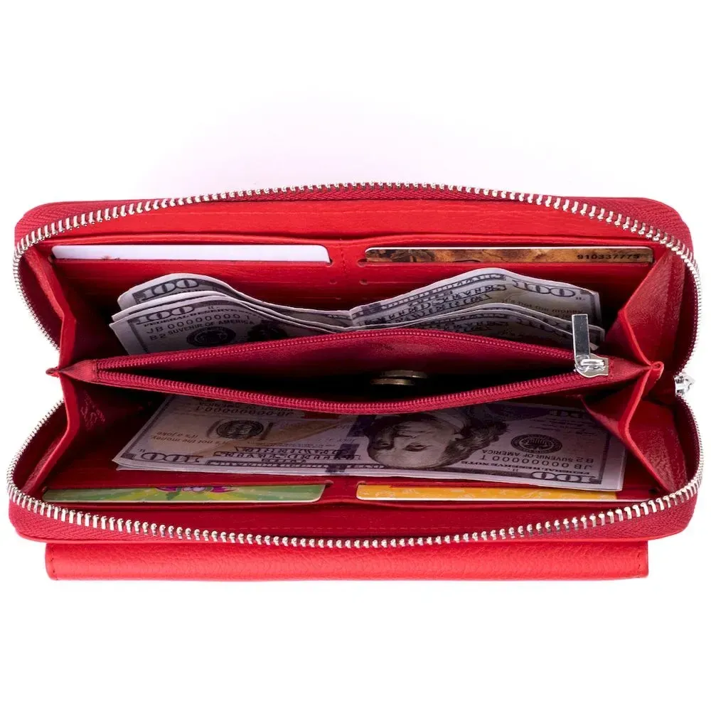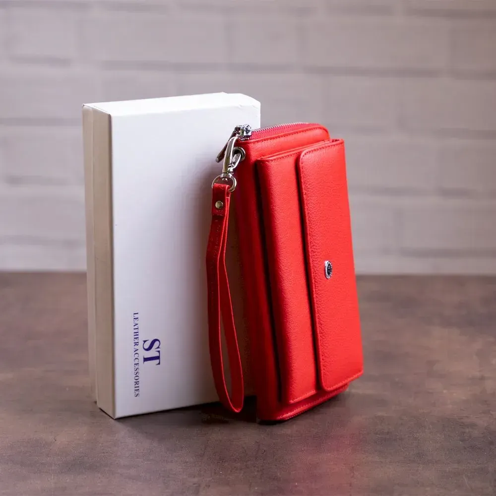 Жіночий місткий клатч з ремінцем на зап'ястя. Модель яскраво-червоного кольору, відповідно до такого гаманця ви точно будете в центрі уваги. Клатч ідеально підійде замість сумочки на вечірку та на кожен день. Гаманець має великий функціонал для будь-якої жінки. Аксесуар виготовлений із натуральної шкіри. У клатчі поміщається мобільний телефон у накладну кишеню на магнітному клапані на лицьовій стороні. Купюри усередину поміщаються будь-якого номіналу в розгорнутому вигляді. Шкіра м'яка і приємна на дотик. Є кишенька на блискавці, в яку можна скласти монети. Аксесуар китайського виробництва. Гаманець стане чудовим подарунком для будь-якої дівчини. У комплекті фірмова коробка.