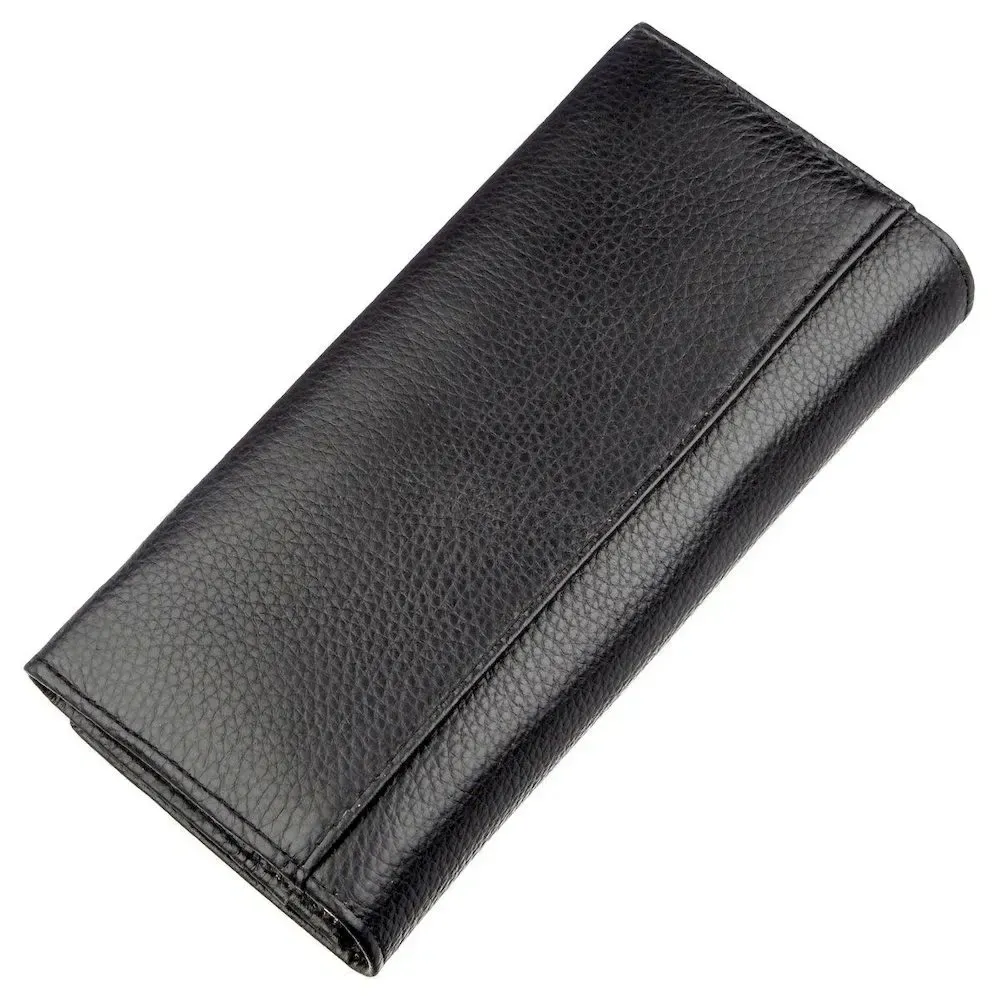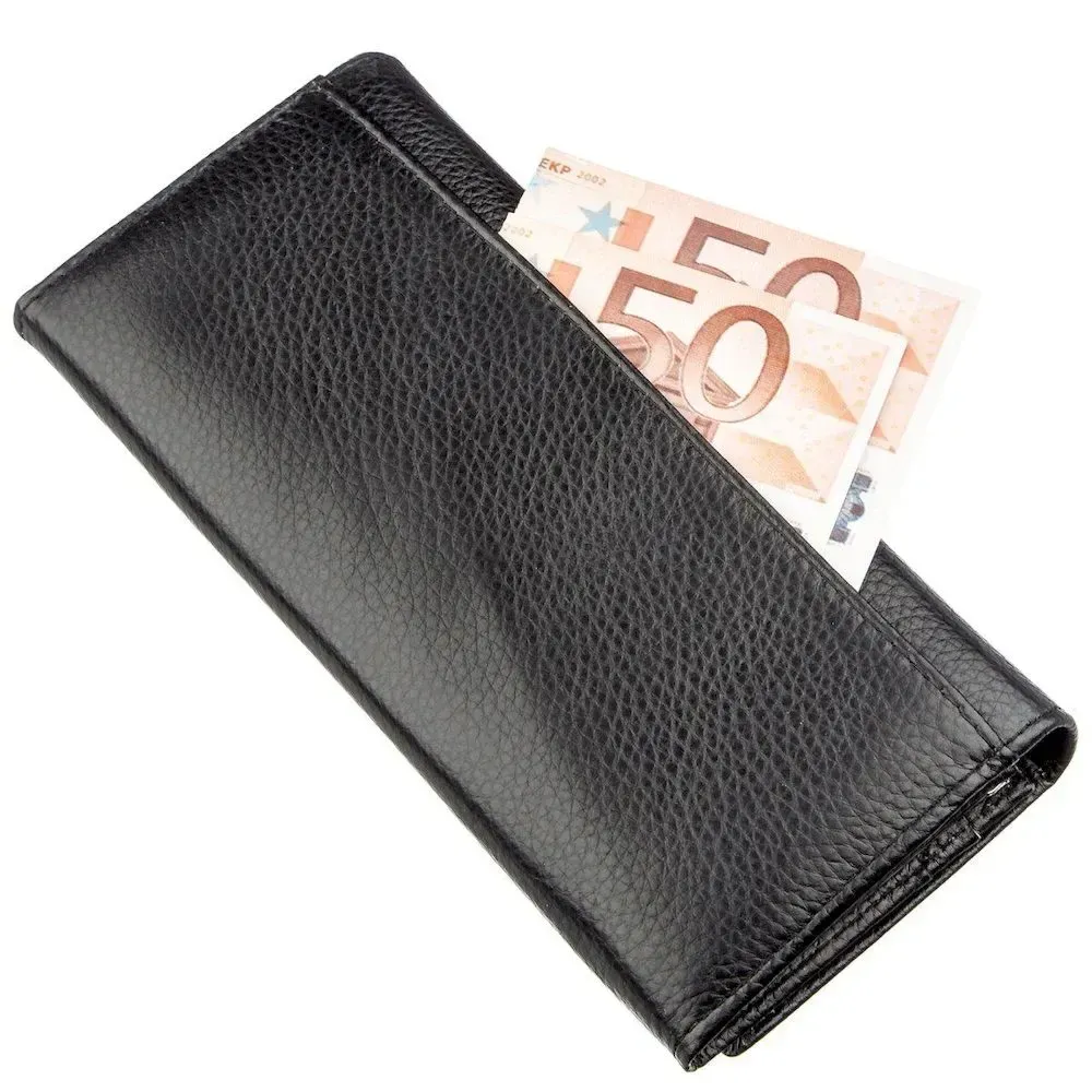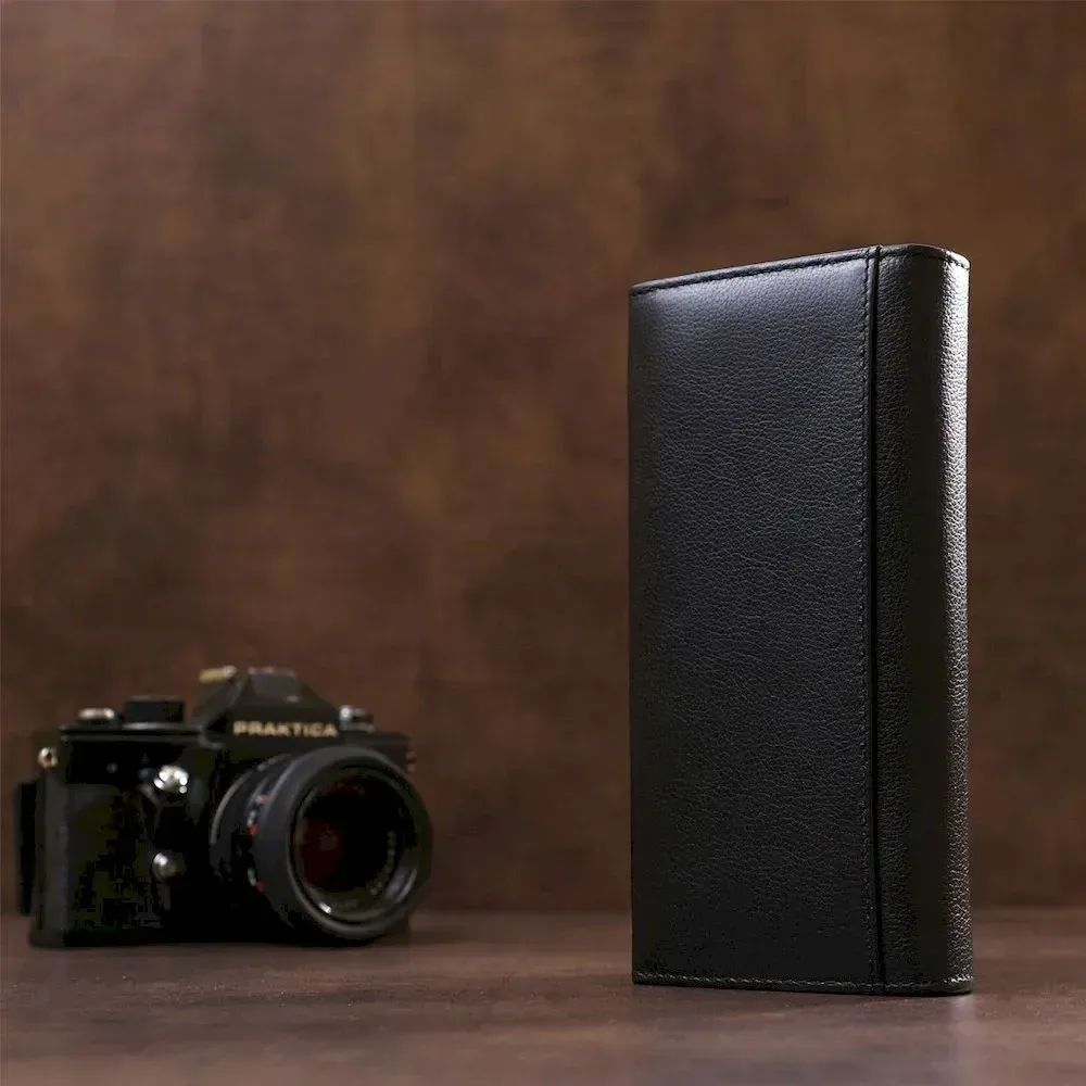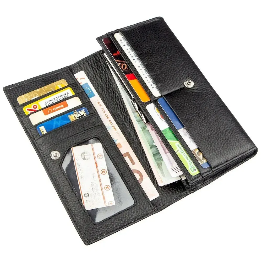 Чудовий стильний і діловий гаманець для впевнених у собі жінок. Виконаний з першосортної натуральної шкіри з м'якою та зернистою фактурою. Колір гаманця – чорний, а це надає йому особливої універсальності, адже виріб підійде під будь-який жіночий гардероб. Усередині Ви знайдете досить великих та містких відділень, у тому числі і зручну монетницю на металевій клямці. Також Вас порадують спеціальні кишені для пластикових та паперових карток та кредиток. Цей аксесуар може стати не тільки Вашою невід'ємною частиною у повсякденному житті, але й карколомним подарунком для близької людини або колеги. Запакований гаманець у тверду картонну коробку.