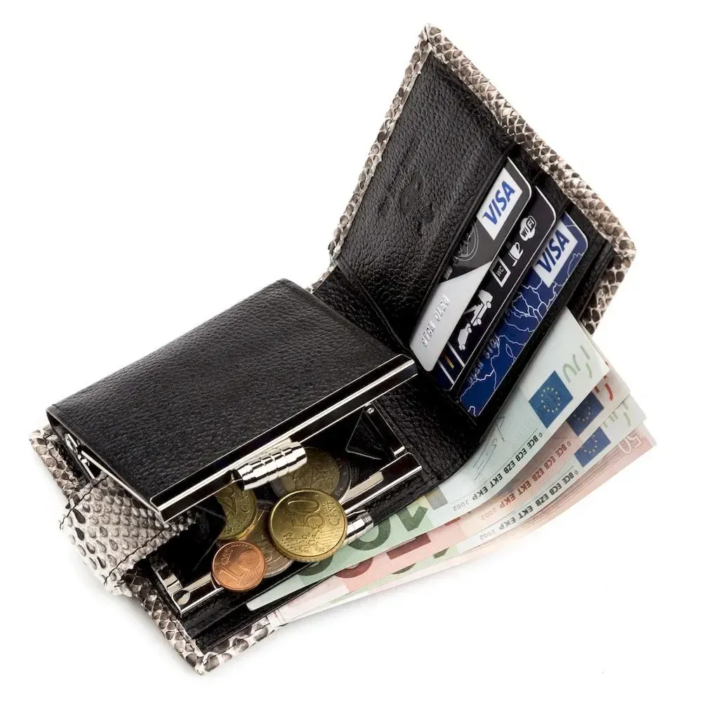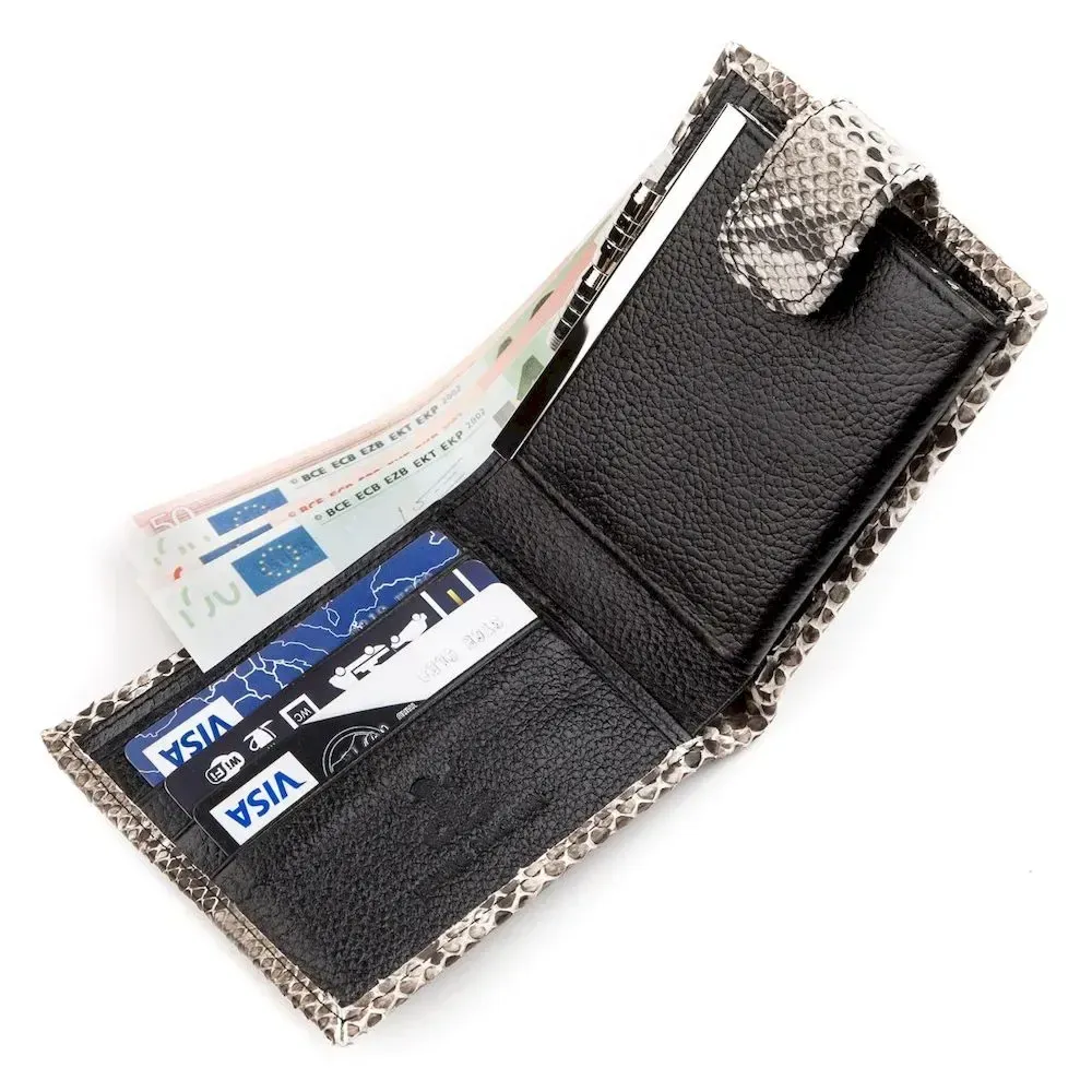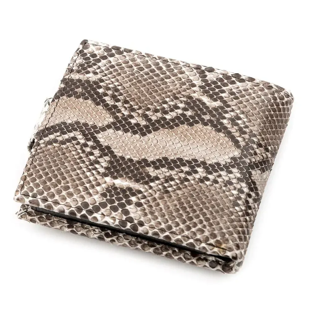 Стильний гаманець з натуральної шкіри пітона, яка має фантастичну фактуру та красу. Аксесуари зі шкіри змії стають з кожним роком експлуатації все красивішим не в переносному, а в прямому сенсі: шкіра розм'якшується і тому краще повторює форму речі. До того ж лусочки поступово «розкриваються», роблячи малюнок ще більш яскравим та неповторним.