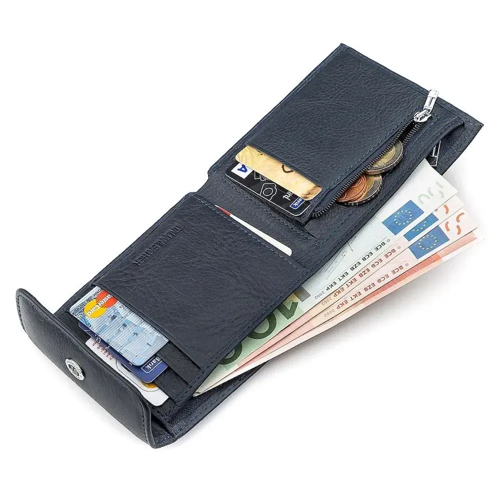 Портмоне для чоловіка вирізняється оригінальним дизайном та практичністю. Завдяки внутрішньому розвороту можна швидко дістати вміст. Гаманець має 2 відділення для зберігання купюр, одне з яких закривається блискавкою. Врізані осередки та плоскі кишені дозволяють зручно розташувати кілька карток. Монети можна надійно заховати в спеціальній кишеньці, що закривається. На лицьовій стороні аксесуара зображено брендовий, новий знак і лаконічний рядок по краю. Виготовлено портмоне з натуральної яловичої шкіри в комбінації зі свинячою шкірою та текстилю на підкладці.
