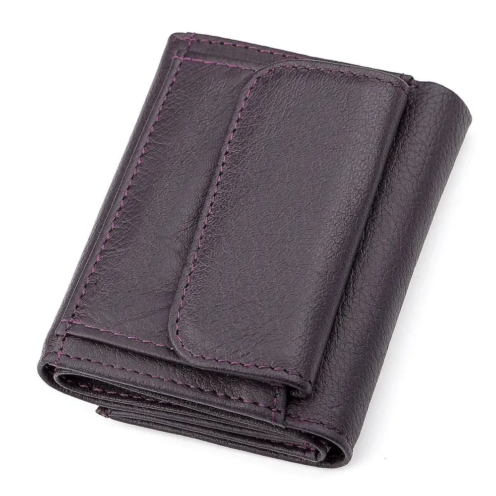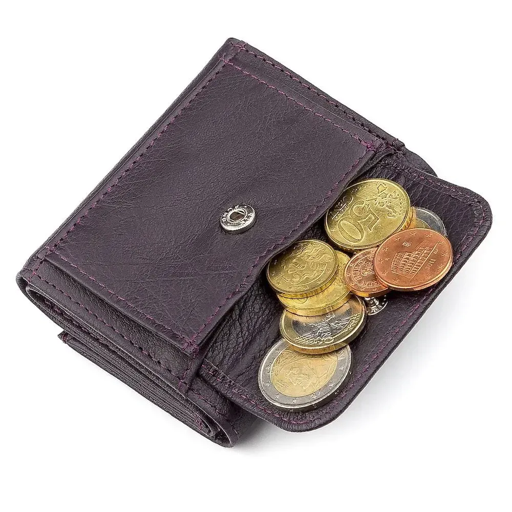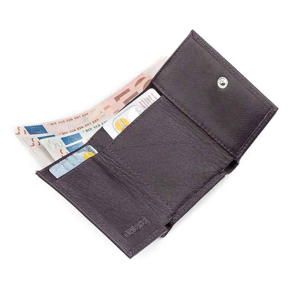 Ця невелика модель зручно розташуватися як у сумці, так і в кишені. Гаманець складається втричі та фіксується металевою кнопкою. Усередині можна побачити два відділення, які призначені для купюр та пари відділень для карток. Зовні є монетниця, яка закривається на кнопку. Виготовлений гаманець із натуральної яловичої шкіри фіолетового кольору. Прикрасою виступає сріблястий фірмовий значок.