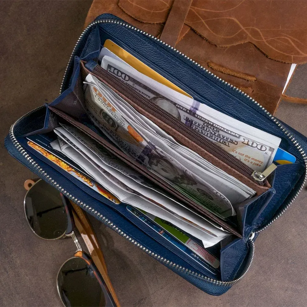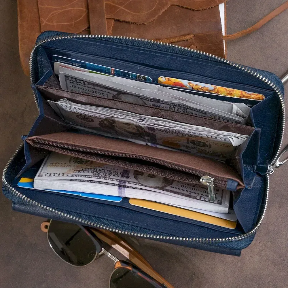Найзручніший і найголовніше місткий жіночий гаманець. Виконана модель у темно-синьому приглушеному кольорі з натуральної м'якої та еластичної шкіри. У моделі дві автономні частини (під купюри та друга під кредитки). Гаманець можна носити як клатч за допомогою ремінця на зап'ястя. Його сучасний та продуманий дизайн не залишить вас байдужою. З таким виробом ви можете бути впевнені, що купюри не пам'ятаються та будуть у повному порядку. Варто зазначити, що у моделі достатньо відділень, щоб розкласти всі гроші картки та навіть вмістити телефон. Усередині виріб виготовлений з натуральної шкіри у поєднанні із щільним текстилем. Гаманець упакований у фірмову картонну коробку білого кольору. Рекомендуємо вам цю модель, якщо ви знаходитесь у пошуку подарунка для дівчини.