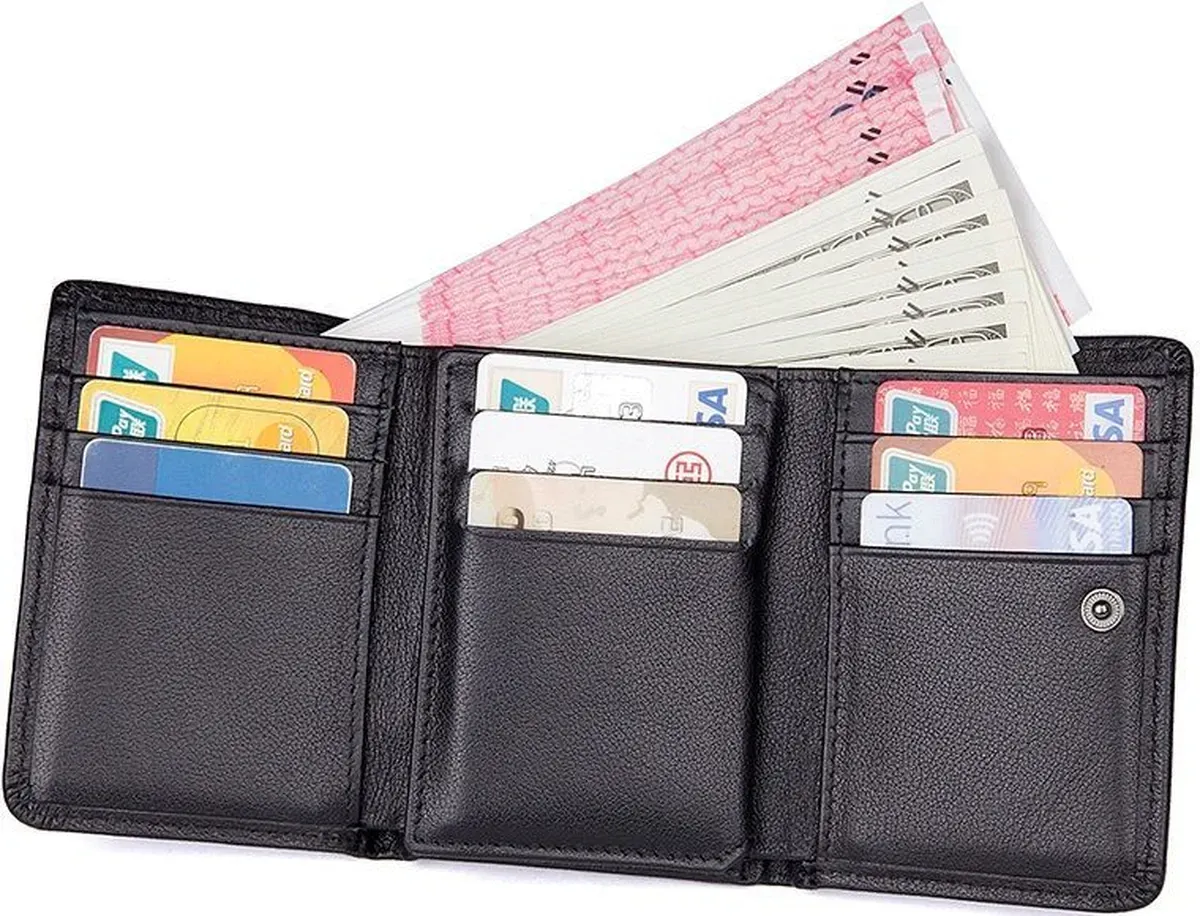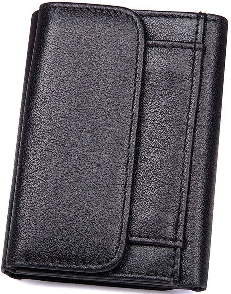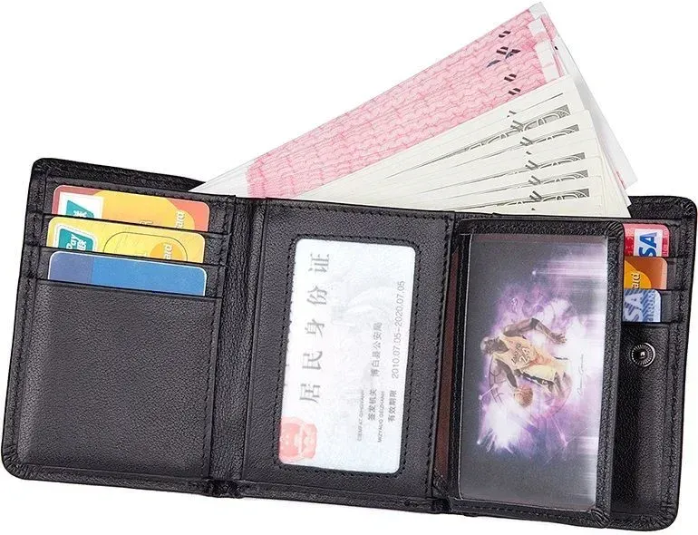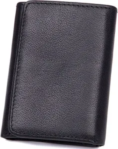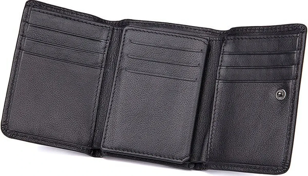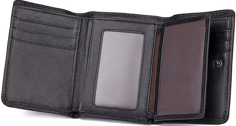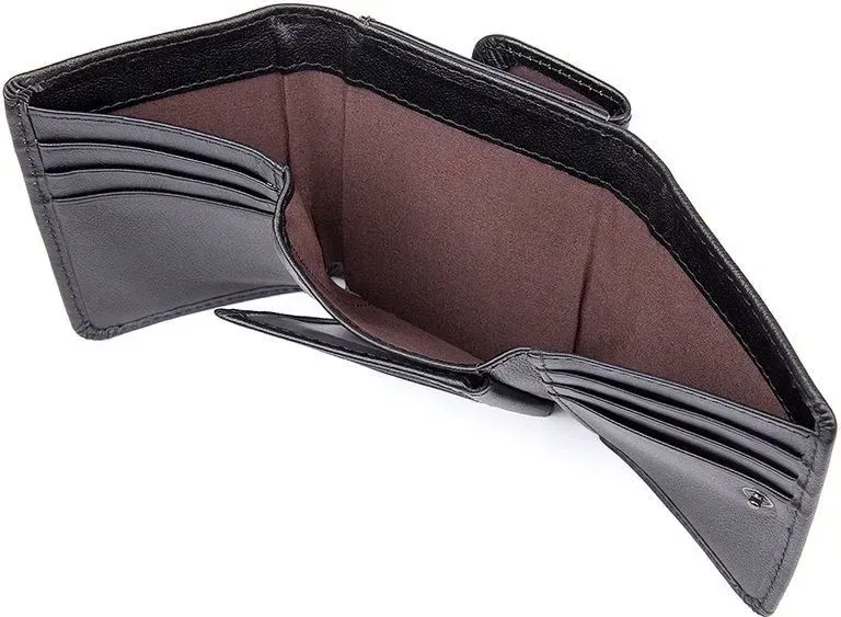 Зручний чоловічий шкіряний гаманець Аксесуар міцно прошить по діагоналі ниткою чорного цвета. Всередині гаманець має велику кишеню для купюр, які поміщаються в розгорнутому вигляді. Усередині гаманця є відділення для карток та прозора кишеня для документів. Сам аксесуар складається вдвічі та закривається на кнопку. На задній стороні аксесуара розташована монетниця, яка надає власнику гаманця швидкий доступ до дрібниці, не відкриваючи при цьому гаманець. Гаманець легко поміщається в кишеню будь-яких штанів і не займає багато місця у сумці або середніх розмірів борсетки. Гаманець упакований у текстильний пилозахисний чохол.