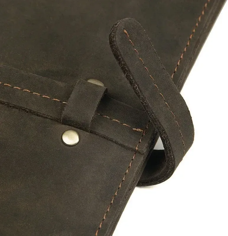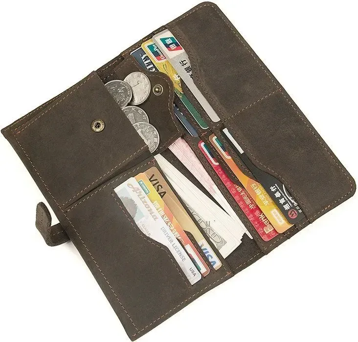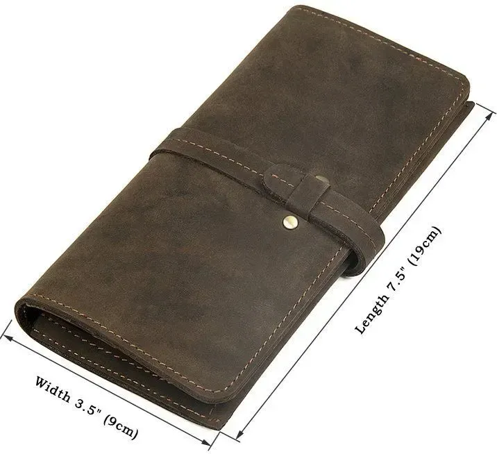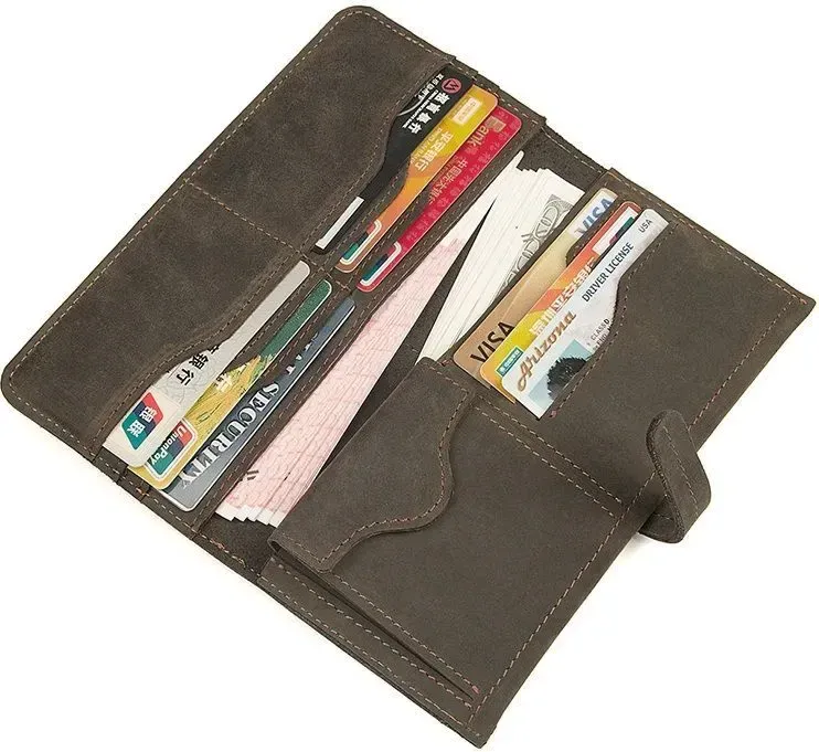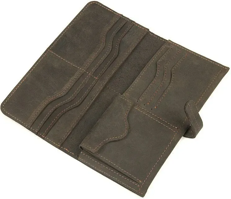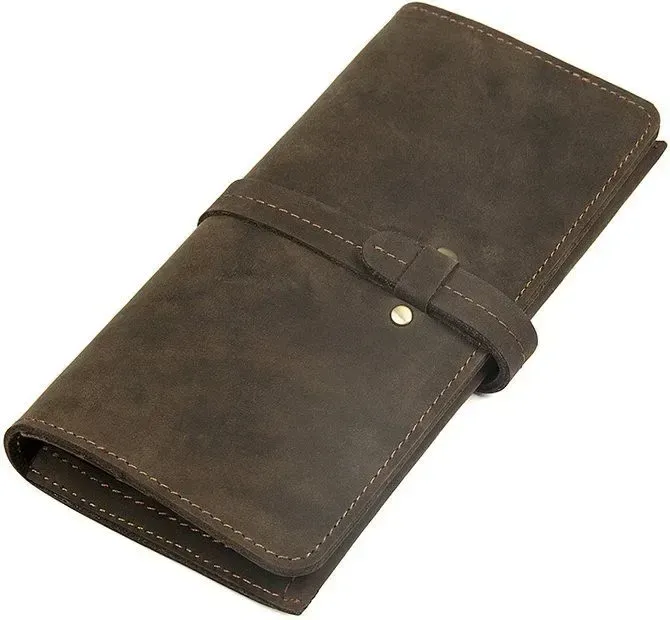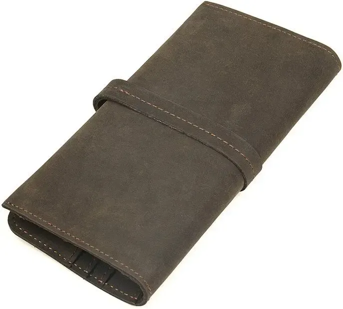 Стильний красивий чоловічий гаманець з вінтажної шкіри, яка дуже популярна в цьому сезоні. Така шкіра відрізняється неоднорідною фактурою та потертостями, які надають їй унікального та неповторного стилю. Гаманець надійно прошитий коричневою ниткою. Аксесуар постачається в текстильному міхучку пилу білого кольору.