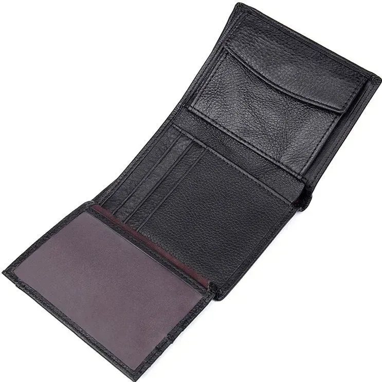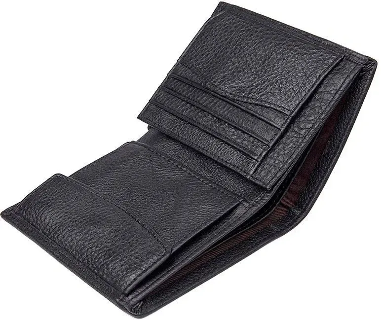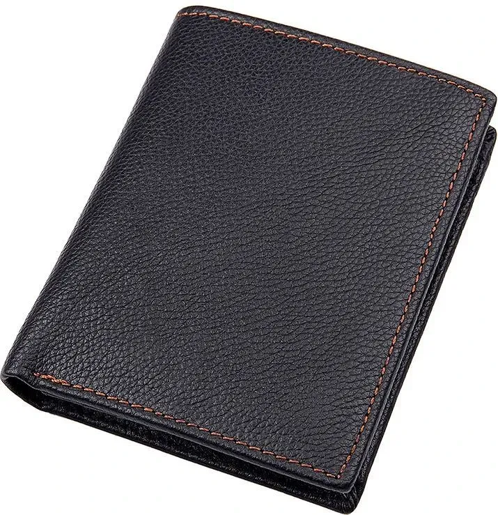 Стильний чоловічий шкіряний гаманець чорного кольору. Аксесуар акуратно прошитий надміцною ниткою світло-коричневого кольору, що надає йому родзинки. Гаманець упакований в текстильний чохол білого кольору.