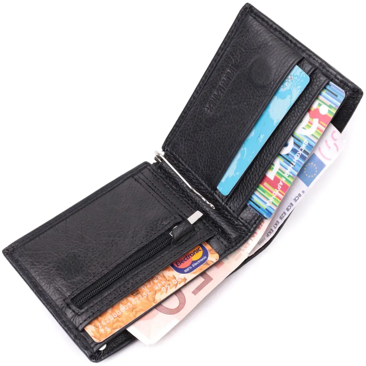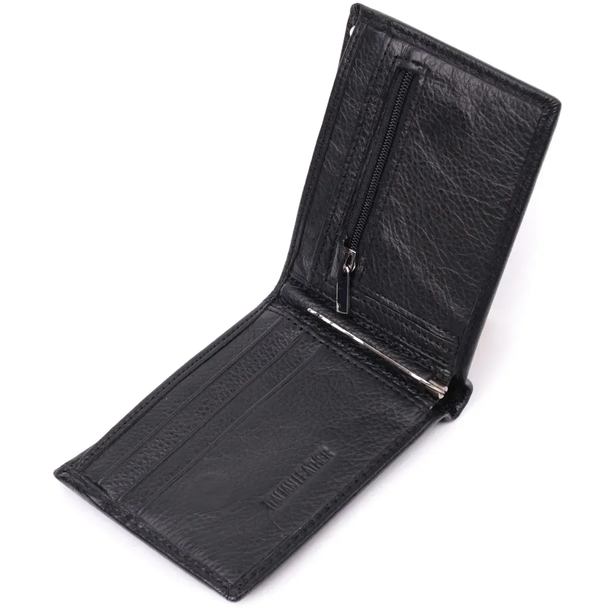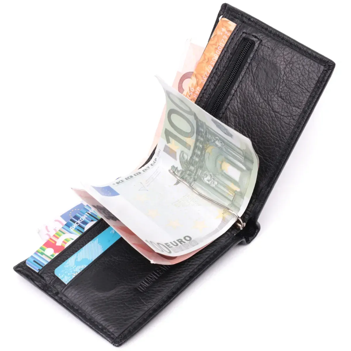 Зручний чоловічий гаманець із затиском усередині, який прикрашений   ;металевим логотипом виробника на лицьовій стороні. Аксесуар з натуральної шкіри, він складається з двох відділень для купюр, кишені на блискавці, чотирьох осередків для карток, двох прихованих кишень, металевого затиску та кишені для монет. Портмоне доповнено надійною фурнітурою та міцною підкладкою, що закривається навпіл, на магніт. Шкіряний та якісний аксесуар на подарунок, це завжди дуже хороша ідея.