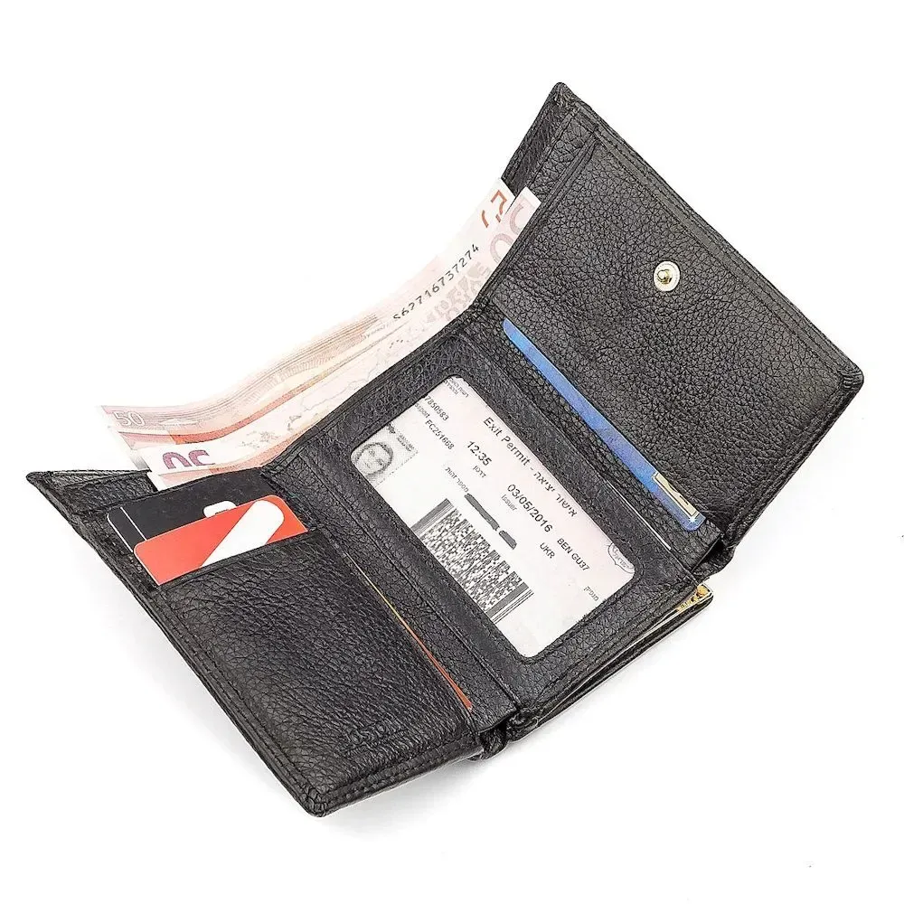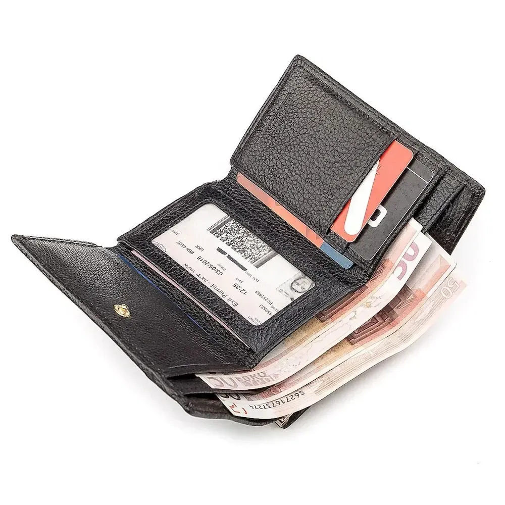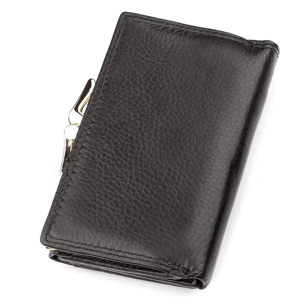 Представлена модель є чудовим аксесуаром з невеликими розмірами та великою функціональністю. Практичність гаманця забезпечується завдяки потрійному додаванню з міцною кнопковою фіксацією, що дозволяє не турбуватися за збереження вмісту. Цей аксесуар стане чудовим доповненням для сумки і не викличе дискомфорту при носінні в кишенях штанів та штанів. Порадує деяких і містка монетниця на клямці, а елегантності чорного кольору додасть надійна фурнітура золотистого відтінку.