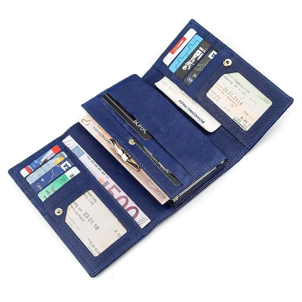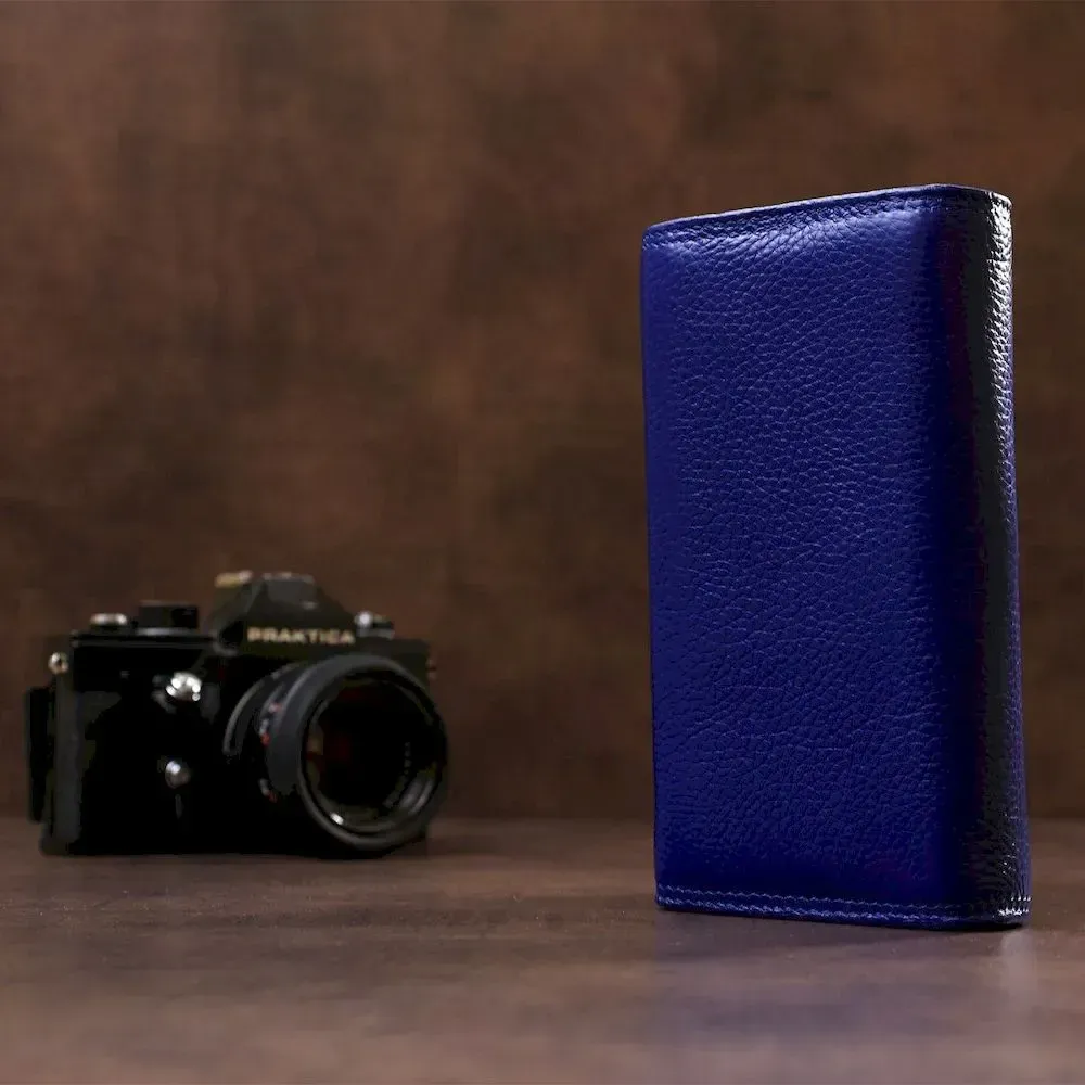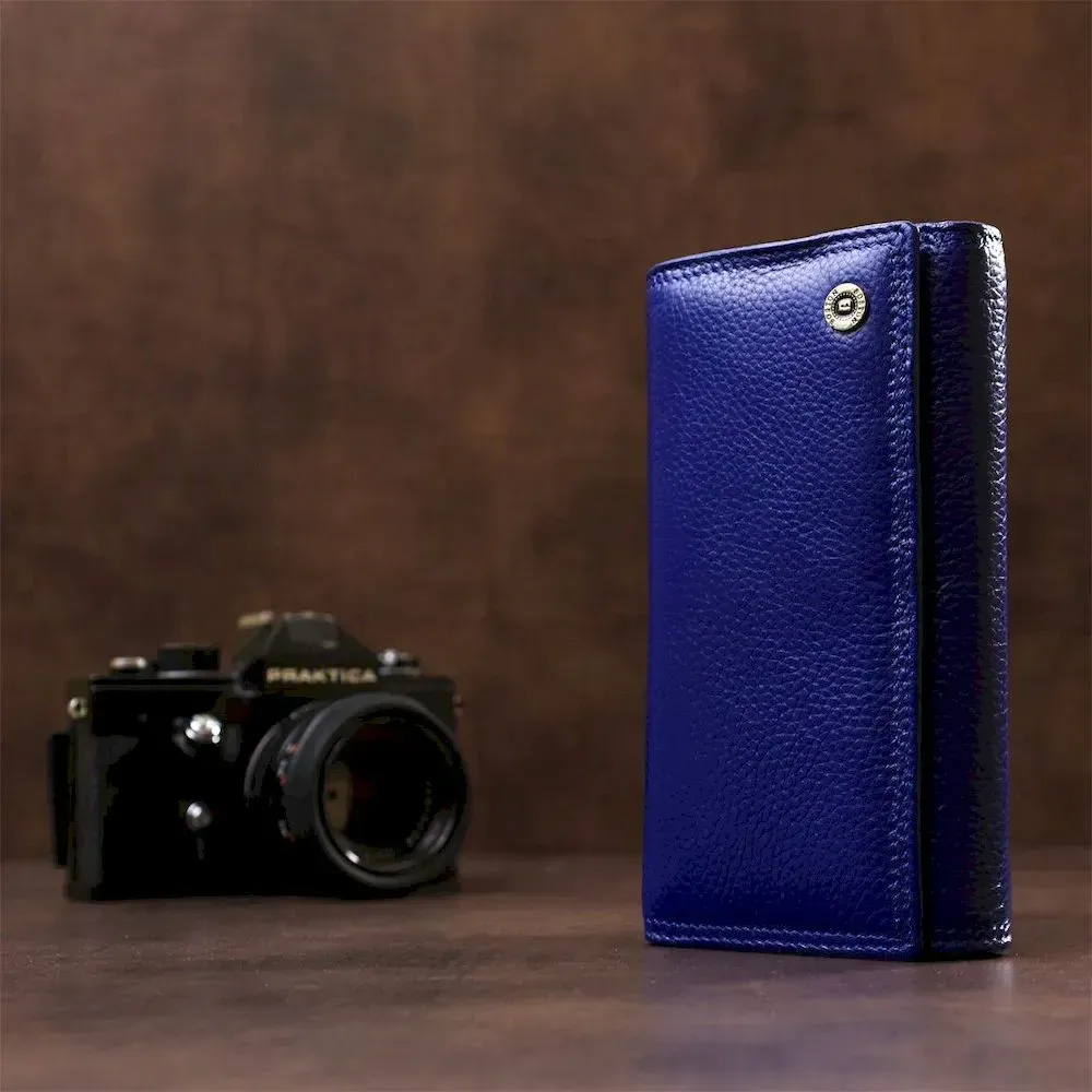 Дана модель гаманця для жінок оформлена в синьому кольорі і прикрашається круглим значком золотистого кольору, розташованим на лицьовій частині. Окрім стандартного функціоналу з кількома кишенями, відділеннями та осередками, є також додатковий блок, який знаходиться усередині. При розвороті забезпечується чудовий та швидкий доступ до вмісту, а також порадує велика монетниця. Вибір та придбання якісних виробів у нашому інтернет-магазині пройде просто та зручно, а широкий асортимент товарів дозволить кожному бажаючому знайти необхідний аксесуар.