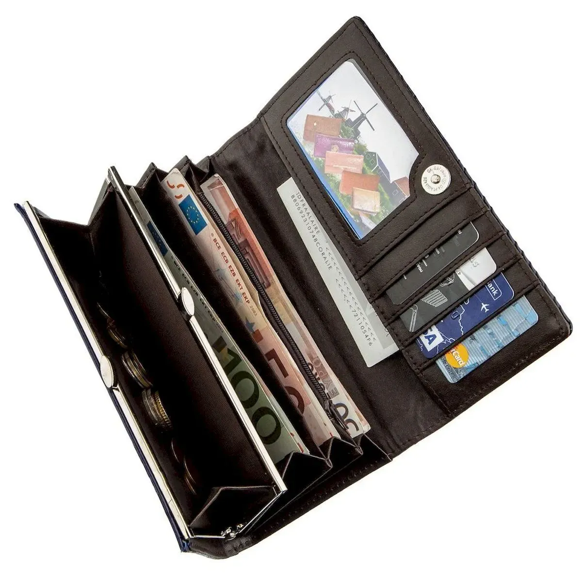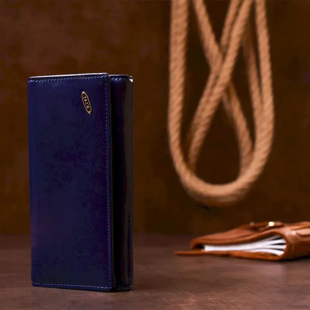 Синій колір уже не перший рік має особливий попит серед представниць слабкої статі. Зручний, м'який та приємний на дотик жіночий гаманець. Модель має три відділення для купюр, монетницю та автономний блок із осередками для кредиток. Гаманець поміститься у жіночу сумочку та не займе багато місця. Тип застібки гаманця магнітна кнопка. По краях модель прошита синім рівним акуратним рядком.