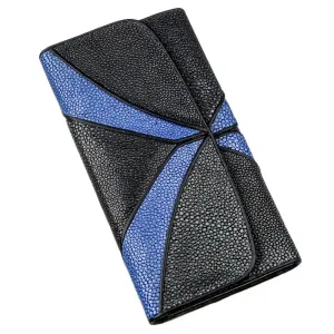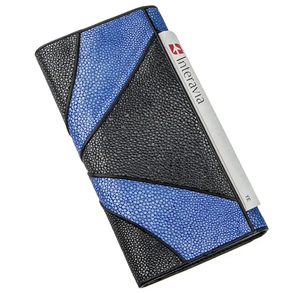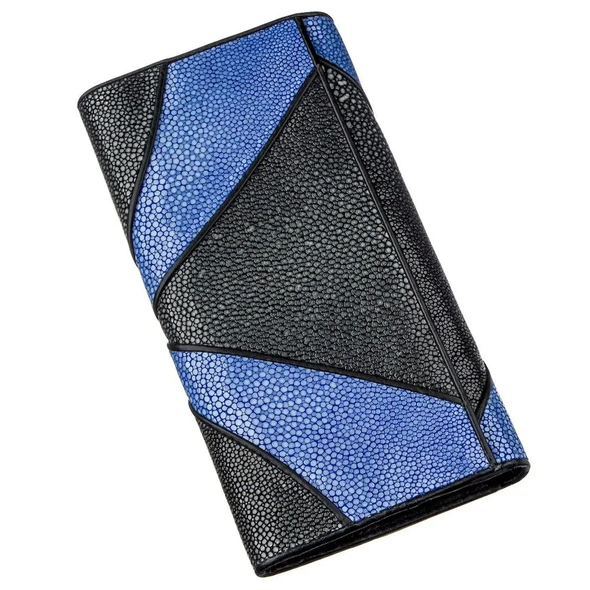 Стильний жіночий гаманець з натуральної шліфованої шкіри морського ската, яка має фантастичну фактуру та красу, а також дуже стійка до зносу, проколів, порізів, до розривів і навіть до вогню. Весь простір шкіри вкритий сотнями дрібних горбків, різного розміру, які грають на світлі, як невеликі бусинки. Аксесуар декорований, контрастними вставками із синьої шкіри, що надають виробу оригінальності та яскравості. Аксесуар стане чудовим подарунком для будь-якої дівчини.