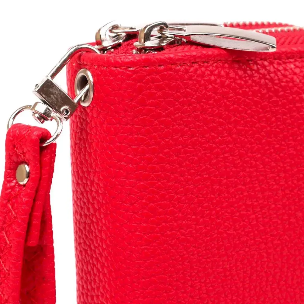 Місткий гаманець з двома автономними та місткими відділеннями. Виріб має зручний функціонал, підібраний на всі побажання дівчат. Виготовлено модель з екошкіри зернистого типу та яскраво-червоного кольору. Впевнені, що гаманець буде до душі будь-якій дівчині. Особливо модель сподобається шанувальникам яскравих відтінків і тим, хто любить досить місткі моделі гаманців. На зовнішній стороні аксесуара є металевий логотип бренду. Гаманець буде чудовим подарунком для близької людини.