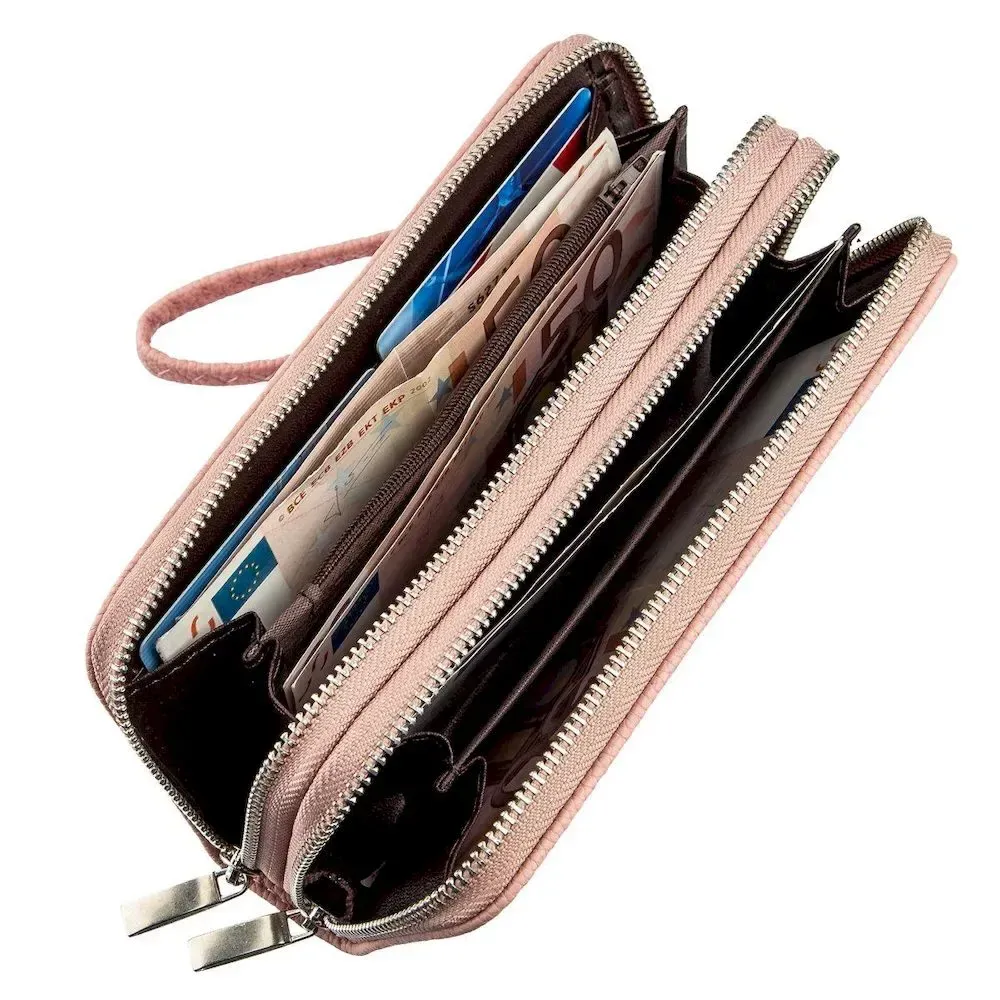 Ніжний гаманець блідо-рожевого кольору дуже м'який і приємний на дотик. Якщо ви любите світлі та ніжні аксесуари такий клатч спеціально для вас. Два автономних відділення, просторі комірки для кредиток надійне фіксують і знімна ручка в комплекті на зап'ястя. Все це продумано спеціально для зручностей будь-якої дівчини. На зовнішній стороні аксесуара знаходиться металевий логотип бренду. Сріблясті блискавки та міцна фурнітура у поєднанні з доступною вартістю додають виробу особливої популярності.