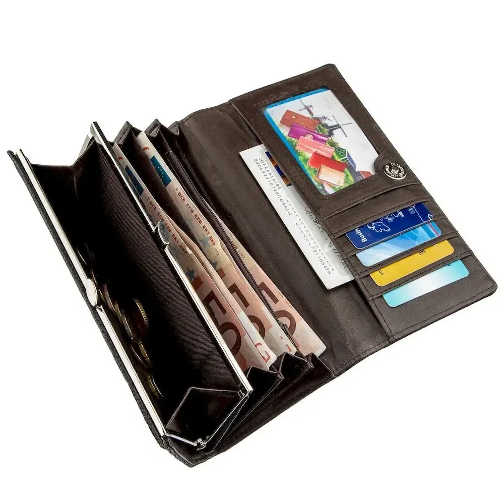 Представлений гаманець виконаний у класичному чорному кольорі з великим функціоналом. У моделі виведено один окремий блок із осередками для кредиток. Всі комірки ідеально підібрані, щоб зафіксувати вашу картку. Просторі відділи для купюр та класична монетниця у поєднанні щільною екошкірою із зернистою текстурою не залишать вас байдужою.