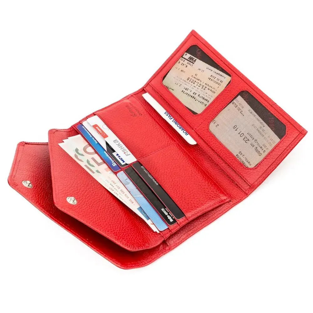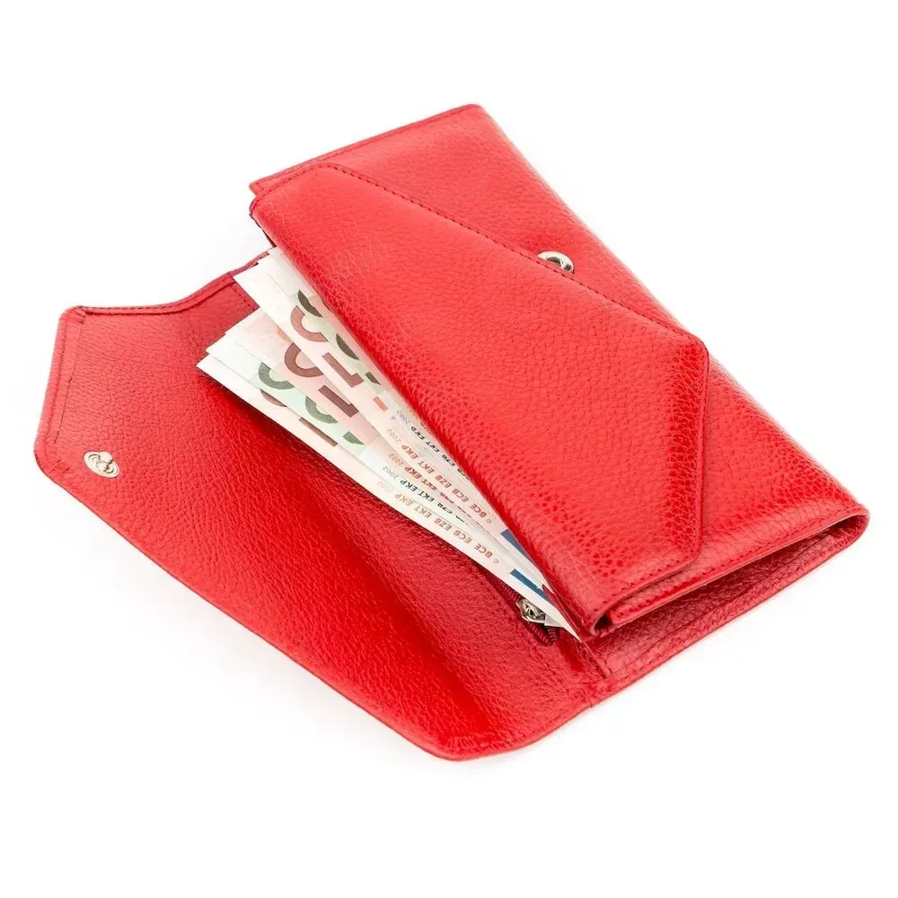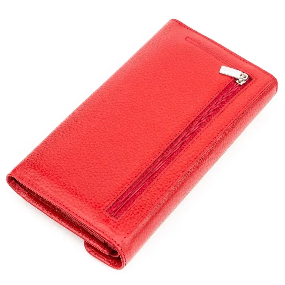Незвичайний жіночий гаманець червоного кольору з натуральної зернистої шкіри, м'якої та приємної на дотик. Аксесуар складається із двох автономних відділень, кожне з яких закривається на окрему кнопку. Перше відділення призначене для зберігання купюр, воно складається з двох відсіків та додаткової кишені на блискавці. У другому відділенні розташовано 8 осередків для карток і дві приховані кишені. Із зовнішнього боку гаманця розташована кишеня на блискавці для монет. В аксесуарі використана якісна та стильна фурнітура, внутрішнє оздоблення: шкіра та текстиль.