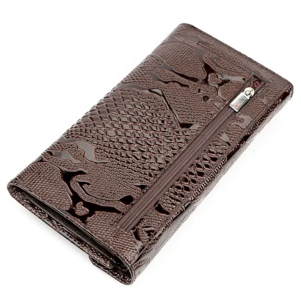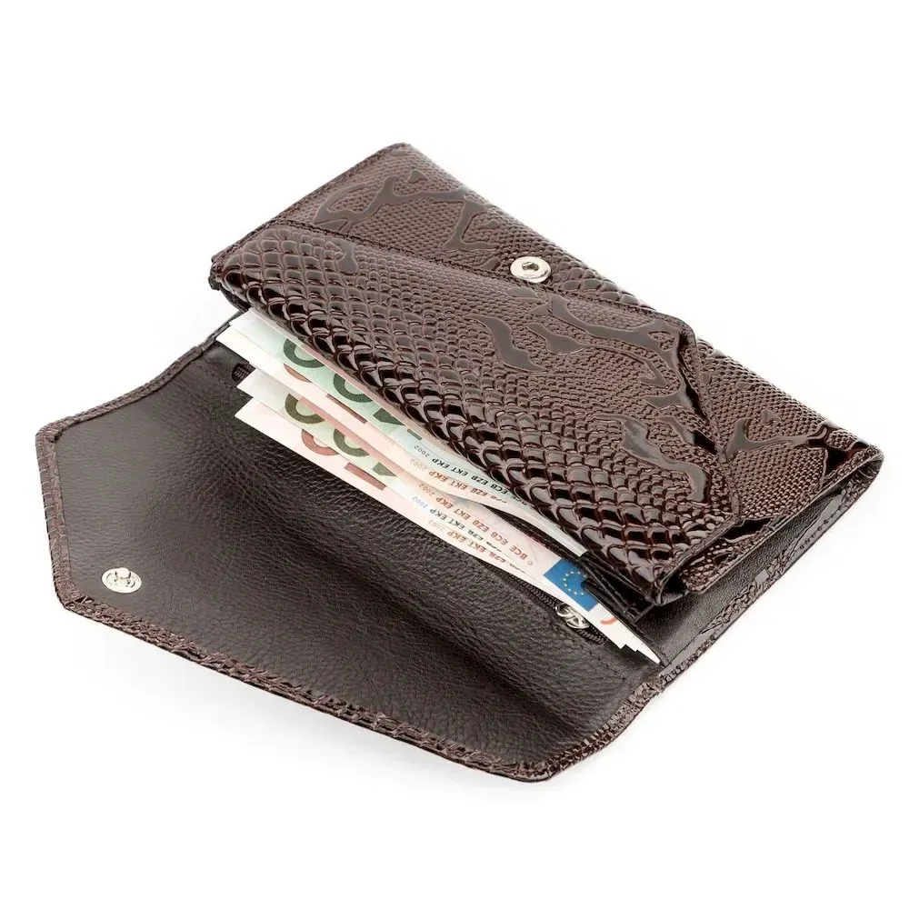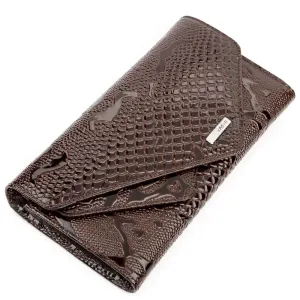 Розкішний жіночий гаманець коричневого кольору з натуральної фактурної шкіри під рептилію, м'якої та приємної на дотик. Аксесуар складається з двох автономних відділень, кожне з яких закривається на окрему кнопку. Перше відділення призначене для зберігання купюр, воно складається з двох відсіків та додаткової кишені на блискавці. У другому відділенні розташовано 8 осередків для карток і дві приховані кишені. Із зовнішнього боку гаманця розташована кишеня на блискавці для монет. В аксесуарі використана якісна та стильна фурнітура, внутрішнє оздоблення: шкіра та текстиль.