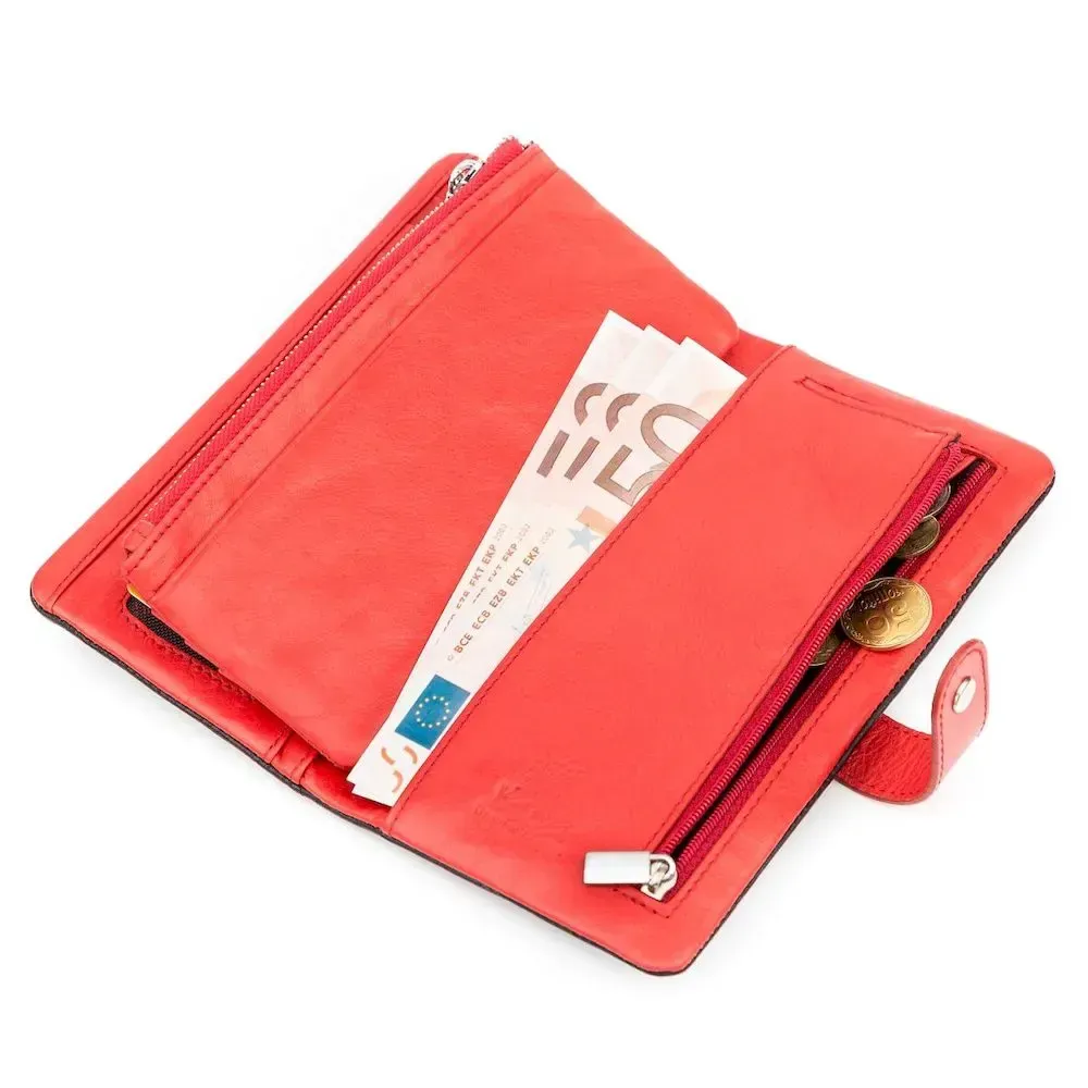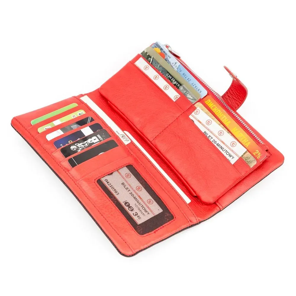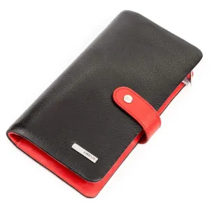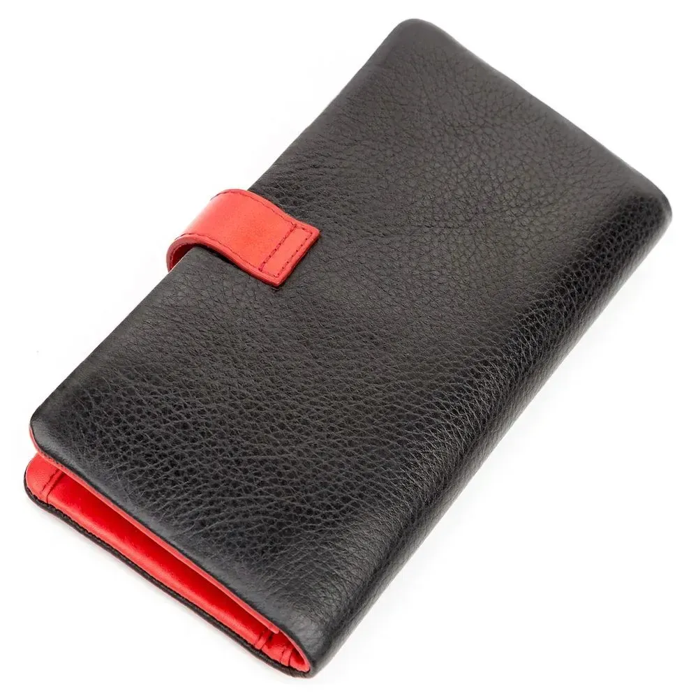 Вертикальний жіночий гаманець з високоякісної натуральної фактурної шкіри - “флотар”. Дуже красивий та стильний аксесуар, який складається з поєднання двох кольорів шкіри: чорної зовні та червоної всередині. Виріб буде оригінальним доповненням до стильного образу сучасної жінки.