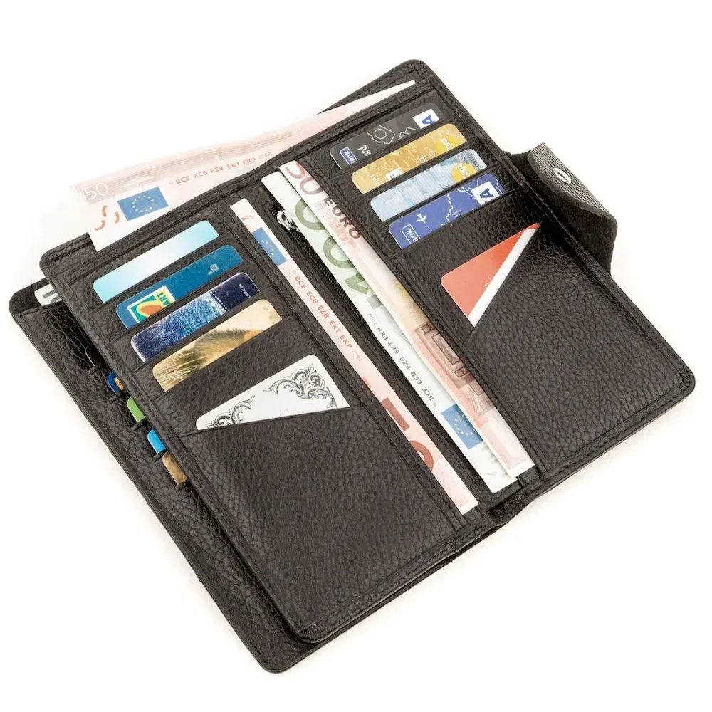 5 внутрішніх кишень і одна широка кишеня на всю довжину і висоти гаманця. Відділення для зберігання купюр. 2 відділення на блискавці, одне з яких на зовнішній стороні. 10 відділень всередині для карток або візиток. Портмоне застібається на кнопку з язичком