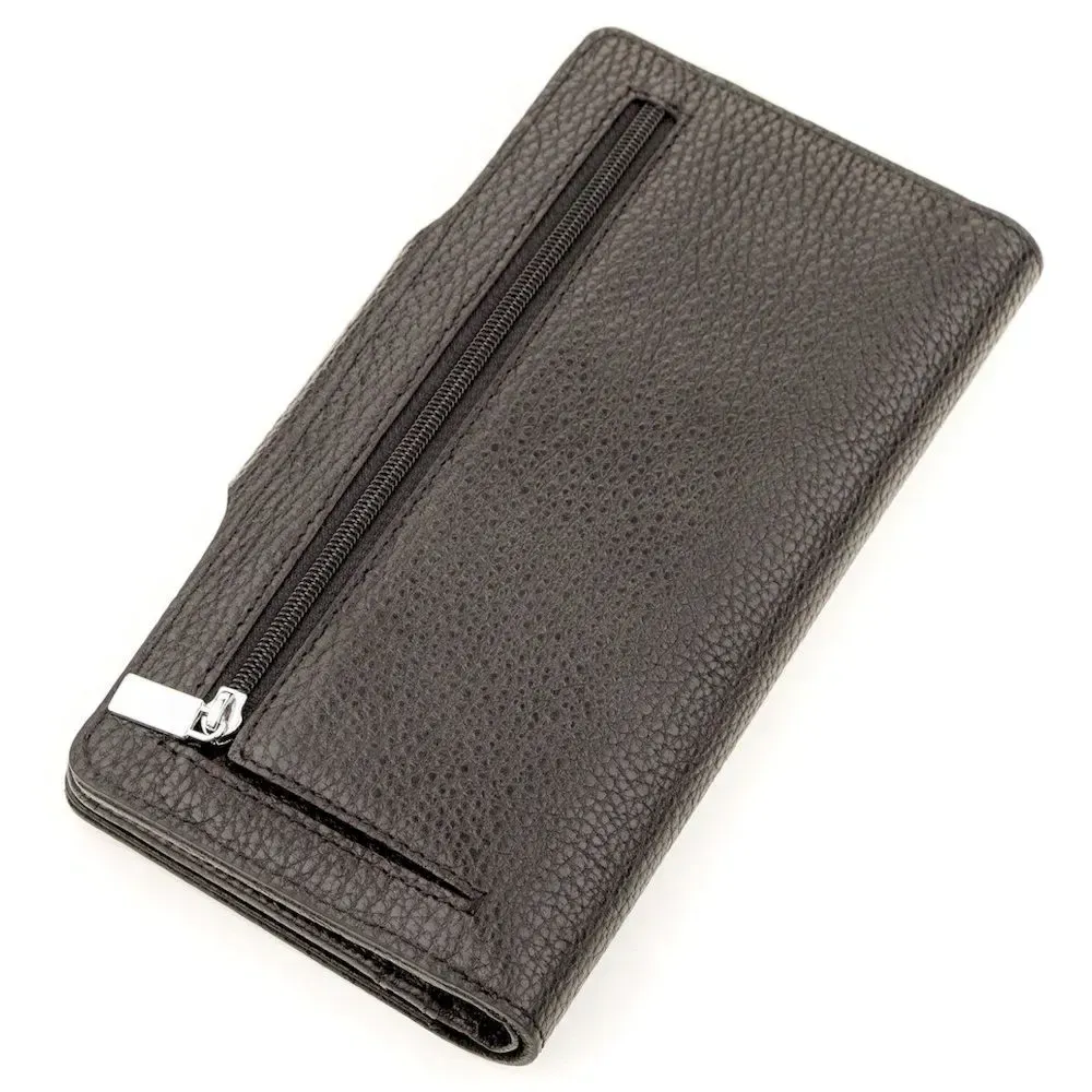 < Місткий чоловічий суворий портмоне чорного кольору з тисненою поверхнею.