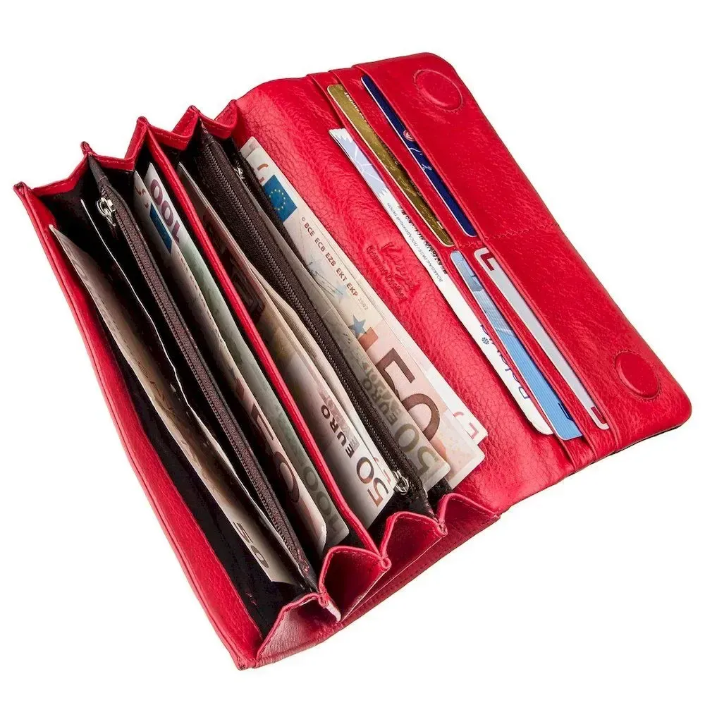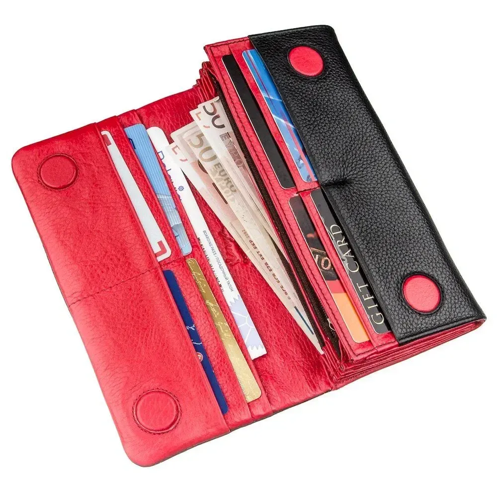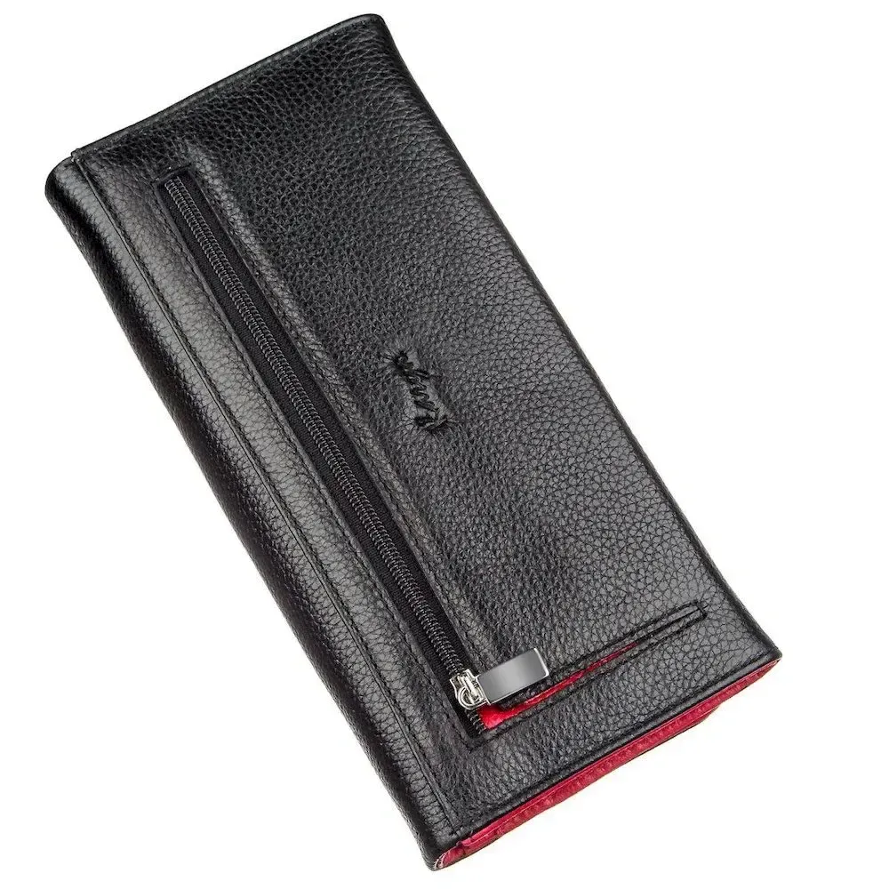 Нова модель з оригінальним комбінованим дизайном. Аксесуар чорний ззовні та червоний всередині. На лицьовій стороні гаманець має металевий логотип бренду. Виріб зручно сидить у руці. У гаманець ви легко розташуєте свої картки та інші дрібниці. Гаманець дуже універсальний і підійде під будь-який ваш образ та стиль. Модель поміститься у жіночу сумочку. Якщо ви шукаєте місткий гаманець – рекомендуємо вам цю модель.