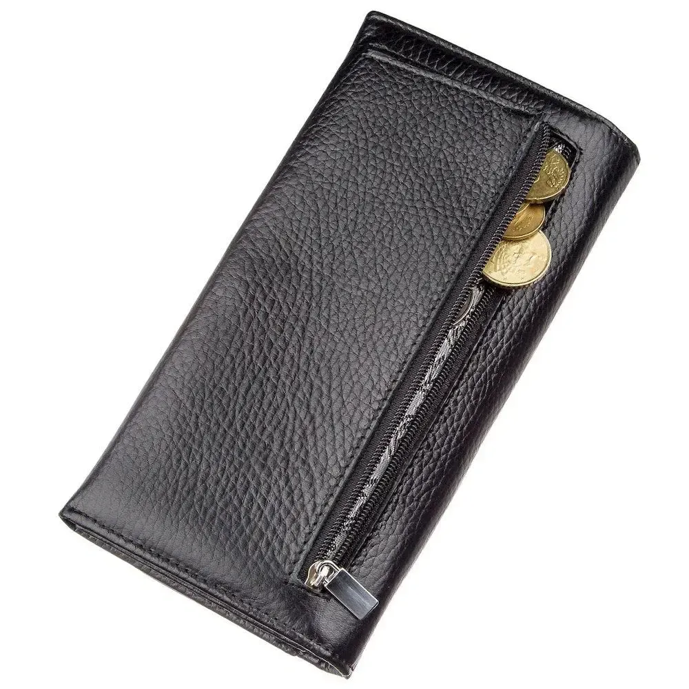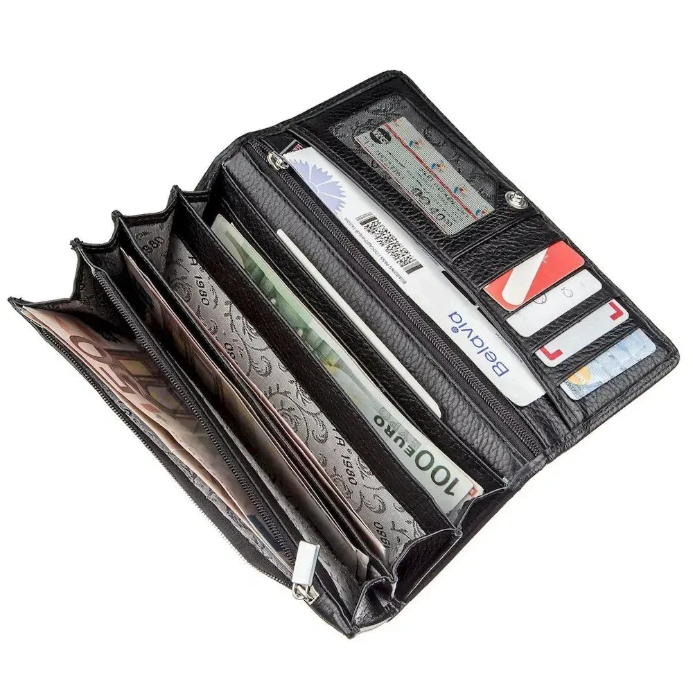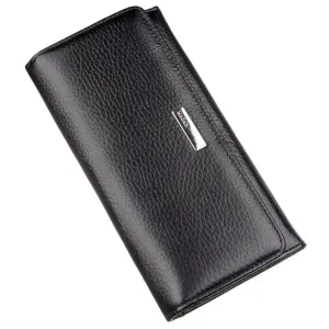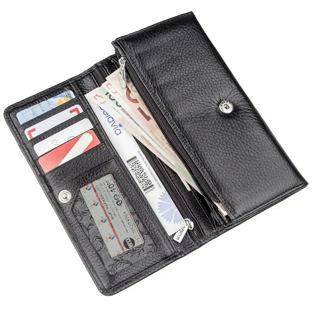 Стильний гаманець чорного кольору з натуральної гладкої шкіри з невеликими прожилками. На задній стороні розташована кишенька для дрібниці на блискавці. Усередині гаманця сіра текстильна підкладка з абстрактним розписом. Підійде для любителів носити з собою багато дрібниць та карток. Модель дуже містка та комфортна. Завдяки високій якості довгий час може бути в ідеальному стані. Гаманець чудово підійде для подарунка як молодій дівчині, так і жінці.