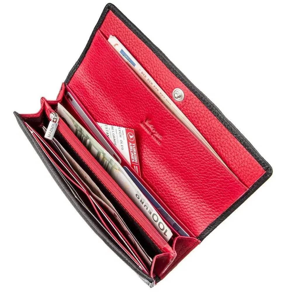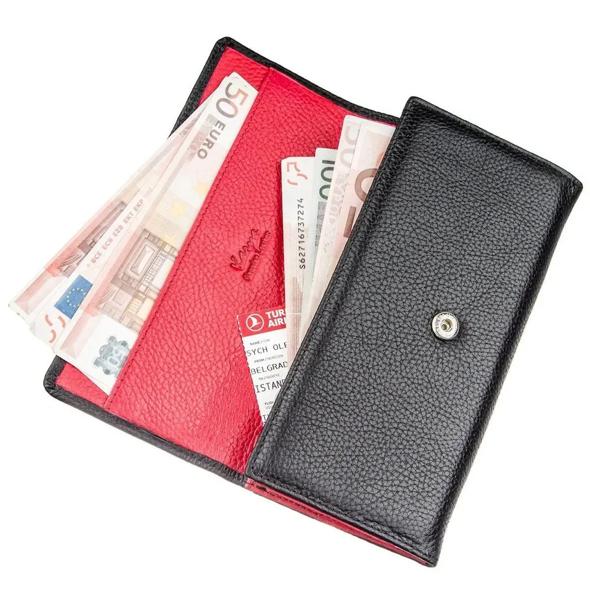 Новинка від турецького бренду з комбінованим дизайном. Виріб зовні виконаний у чорній шкірі, а всередині – у червоній. Виглядає модель дуже стильно та оригінально. Гаманець зручно сидить у руці. Гроші в гаманець розміщуються у розгорнутому вигляді. Модель досить функціональна та продумана. У комплекті до гаманця йде фірмова картонна коробка білого кольору. Гаманець стане чудовим подарунком для близької людини.