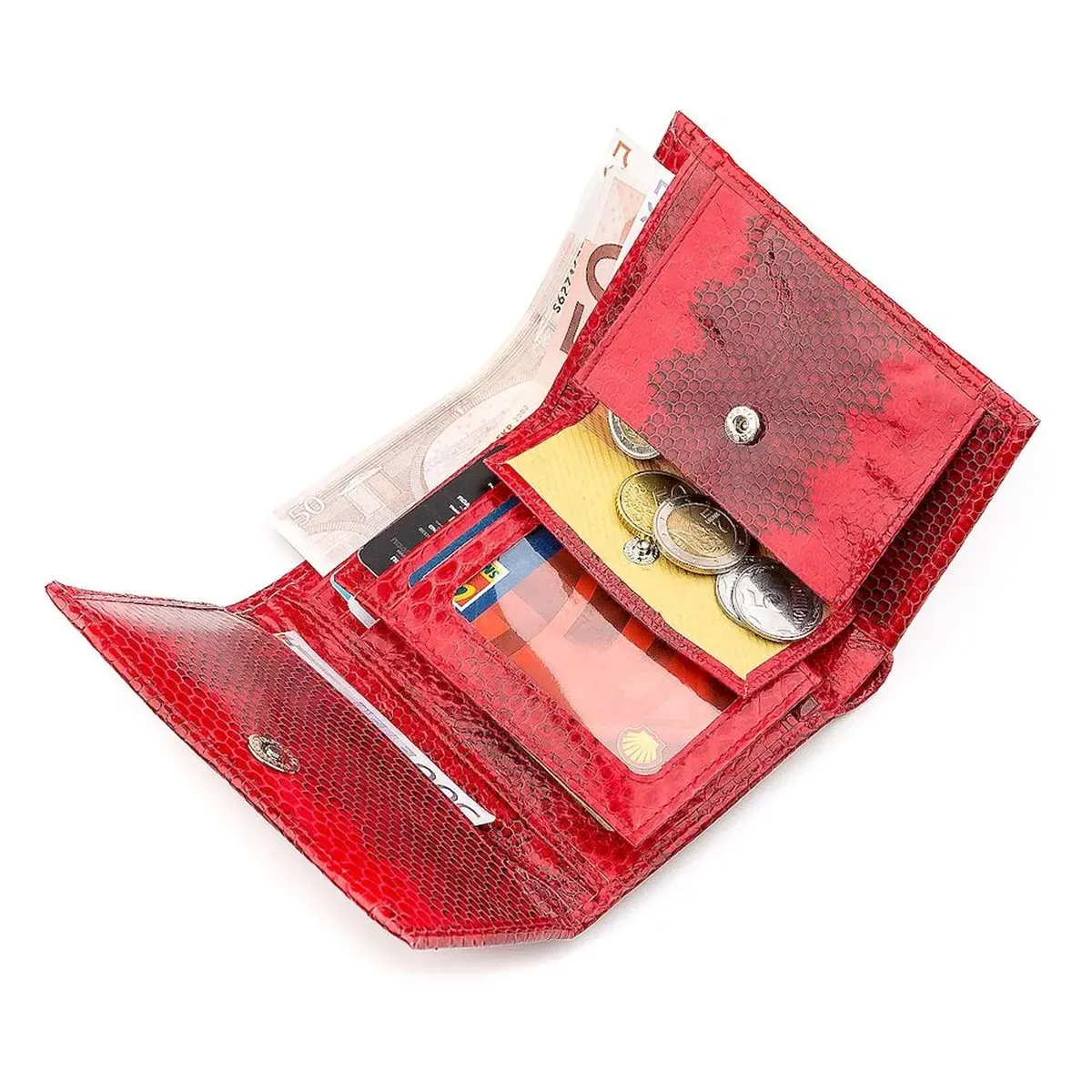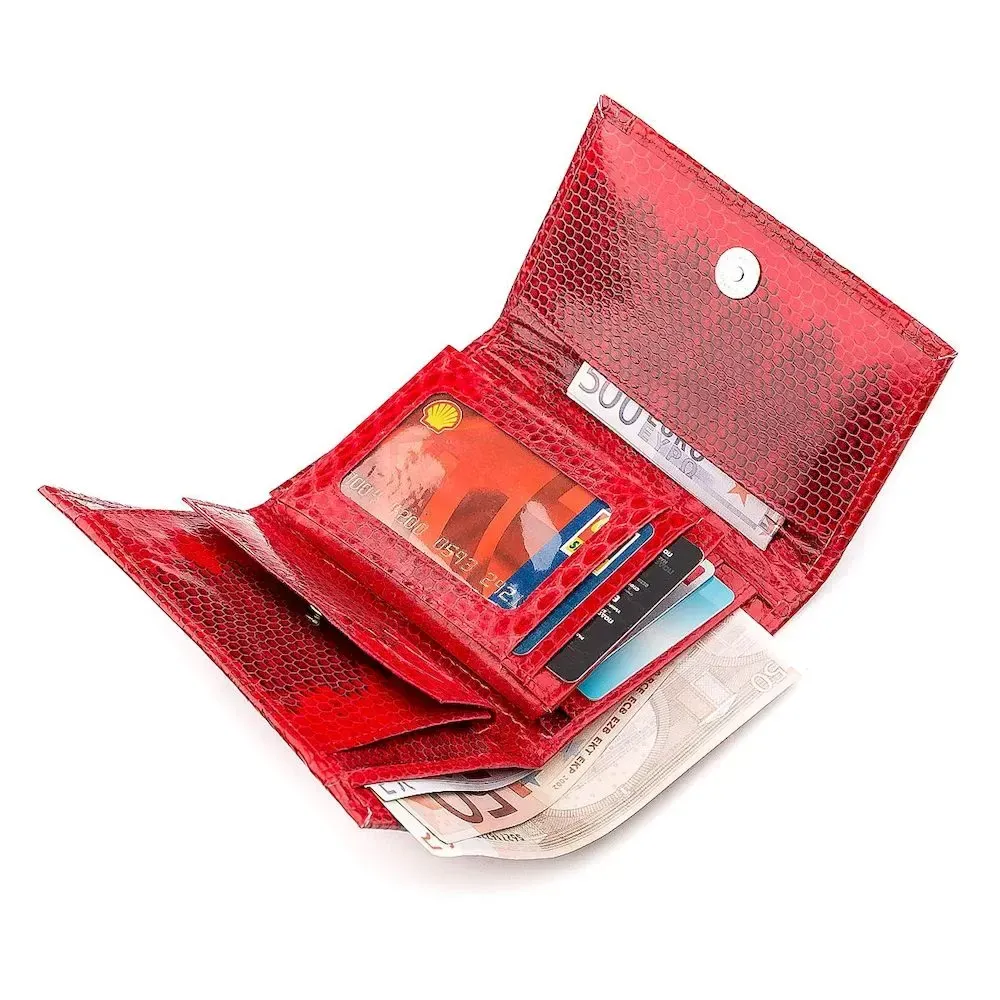 Легкий яскравий та компактний гаманець червоного кольору. Оригінальний унікальний індивідуальний дизайн. Аксесуар не займе багато місця в сумочці та уміститься у маленький клатч. Виготовлений із натуральної шкіри морської змії. Гладка лакова поверхня із цікавим малюнком. Буде чудовим подарунком для близької людини. Не залишить байдужим її власника.
