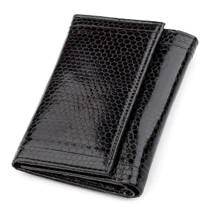 Дуже компактний гаманець з оригінальним дизайном. Універсальний чорний колір підійде під будь-який образ. Виконаний із натуральної шкіри морської змії. Виглядає досить стильно та оригінально. Гладка лакова поверхня із цікавим малюнком. Не займе багато місця у сумці та вмістить все необхідне. Буде чудовим та оригінальним подарунком для близької людини.