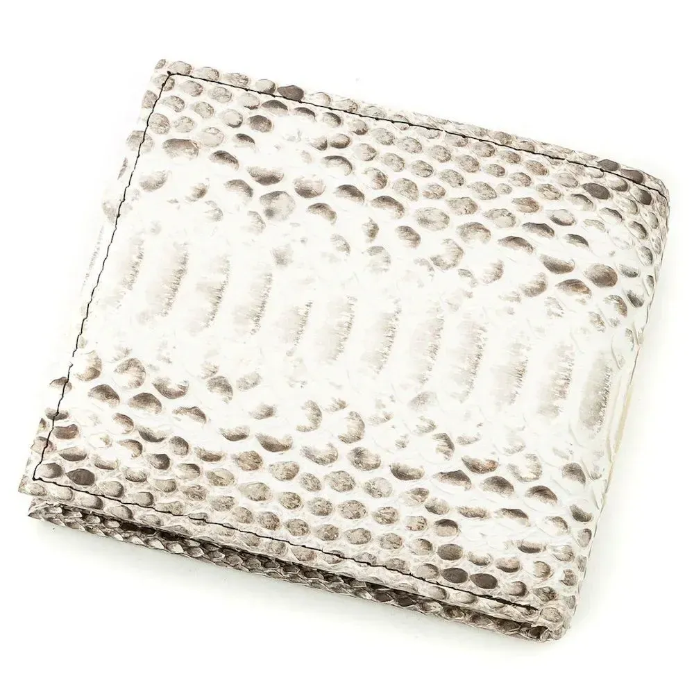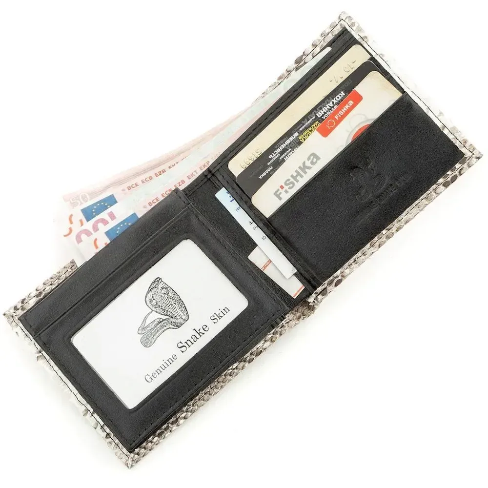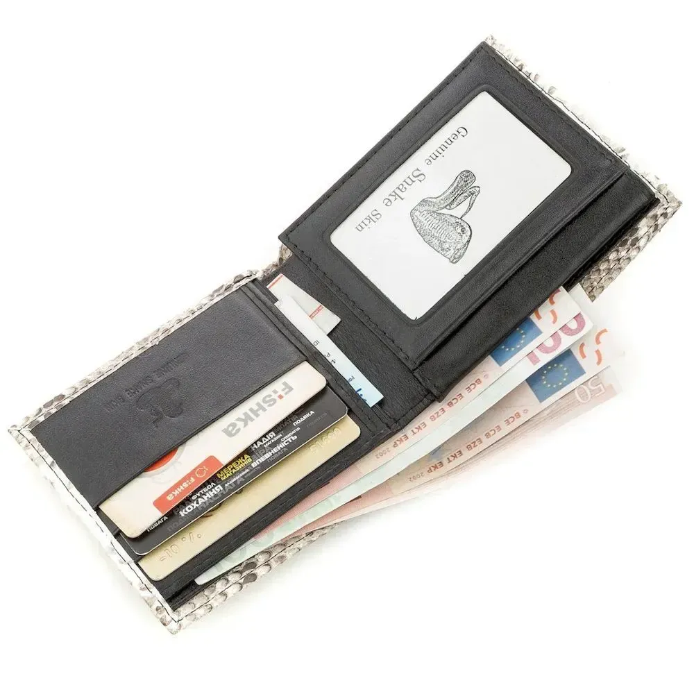 Компактний гаманець з натуральної шкіри пітона, яка має фантастичну фактуру і красу. Натуральна шкіра пітона приємна на дотик, вона відома своєю еластичністю та прекрасними ізоляційними властивостями, також характерною ознакою натуральної шкіри є наявність лусочок. Нерідко великі лусочки можуть відгинатися, створюючи хаотичний малюнок. Купуючи вироби зі шкіри пітона Ви, безсумнівно, залишитеся задоволені такому подарунку собі або своїм близьким. Виглядає дуже багато і розкішно.
