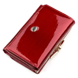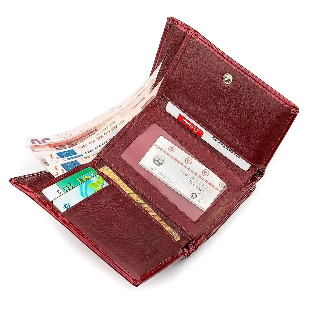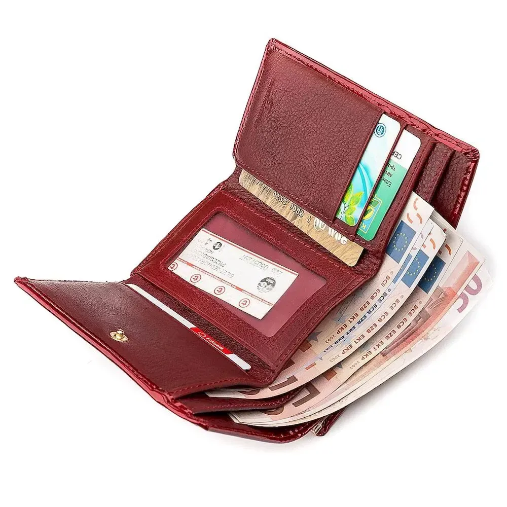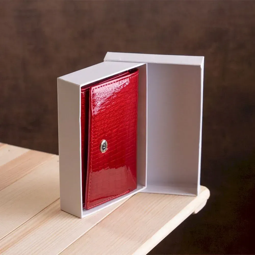 Яскраво червоний лаковий гаманець може доповнити будь-який образ кожної представниці прекрасної статі. Ця модель відрізняється своїми компактними розмірами завдяки складанню втричі та надійній фіксації клапана на кнопці. У функціоналі крім стандартного набору розташовані додаткові слоти для кредиток та спеціальне віконце, де можна зберігати фото чи документи. Також у гаманці є містка монетниця з унікальною застібкою. У нашому магазині ви можете замовити мініатюрний гаманець для жінок за унікальною вартістю.