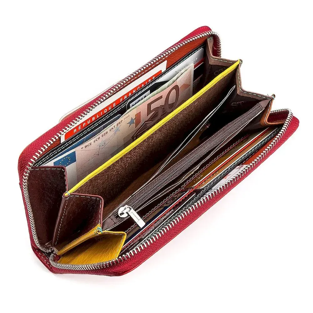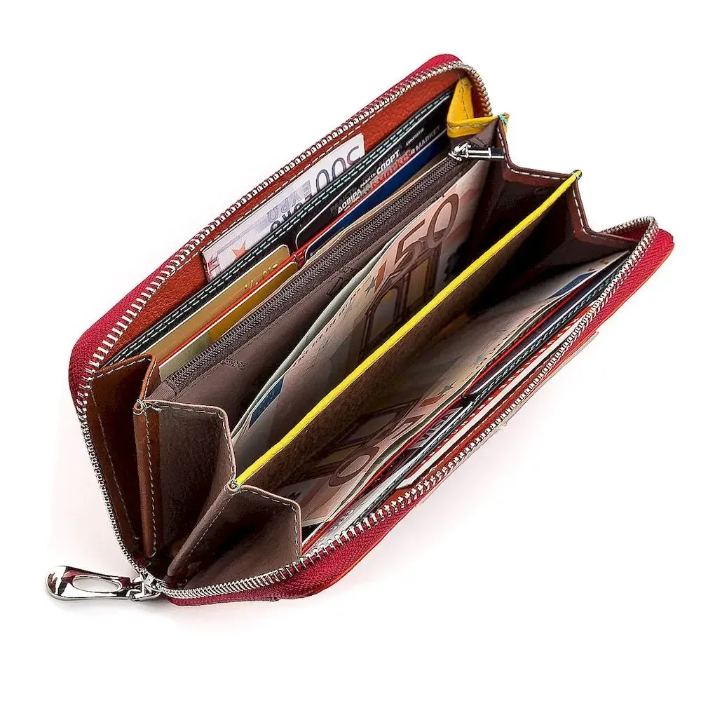 Дана модель гаманця користується своєю популярністю завдяки оригінальним кольоровим відтінкам , унікальній структурі та грамотному функціоналу Для обробки лицьової сторони використаний червоний та помаранчевий відтінок. Усередині виробу можна побачити широку гамму кольорів. Картки та паперові гроші можна зберігати у спеціальних відділеннях. Також усередині є кишеня-перегородка із замочком та кілька прилеглих кишень. Для виготовлення використана яловича шкіра.