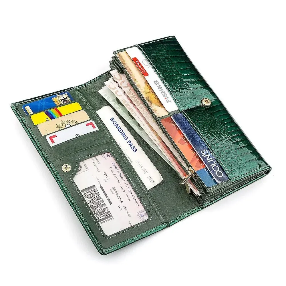 Представлений жіночий гаманець вирізняється привабливим дизайном у зеленому кольорі, виконаним під шкіру крокодила, з додатковим лаковим покриттям. Конструкція зі стандартним, але чудовим функціоналом – відділення для паперових банкнот, 8 сегментів для платіжних карток. Також є кишені для монет на надійній застібці. Як матеріал використовується натуральна та екологічна шкіра зовні, а свиняча для внутрішньої обробки. У нашому інтернет-магазині є досить широкий асортимент якісної продукції, що відрізняється стилем, елегантністю та привабливістю.