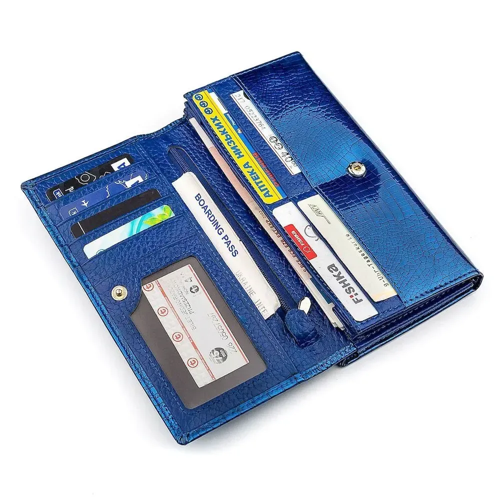 Відмінний гаманець з натуральної шкіри, представлений у синьому кольорі, який легко зможе виділити індивідуальність господині. Прекрасно продуманий та пропрацьований функціонал забезпечує достатню місткість із вшитими відділеннями та відсіками, а також кишень для дрібних цінних речей. Порадує і фірмова коробка, завдяки якій подарунок стане ще кращим і зухвалим.