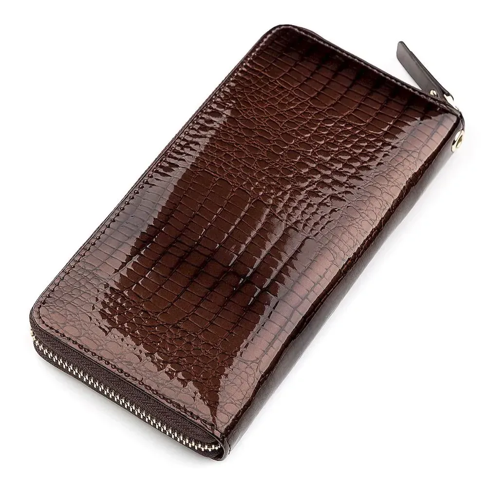Представлений жіночий гаманець має середні розміри, виготовляється виключно з натуральної шкіри, завдяки чому зручно розташовується в руках. Аксесуар має механізм, що закривається у вигляді блискавки, а всередині є багато відділень і секцій для зручного розташування паперових купюр, і платіжних карток. Порадує шанувальниць стилю цікавий ремінець на зап'ясті та декорований малюнок під шкіру крокодила. Зовнішній вигляд відрізняється привабливістю та презентабельністю.