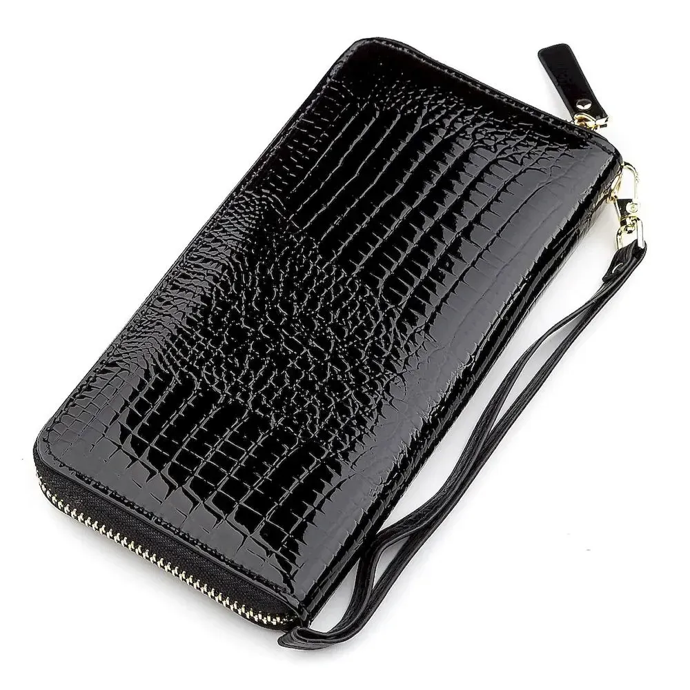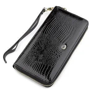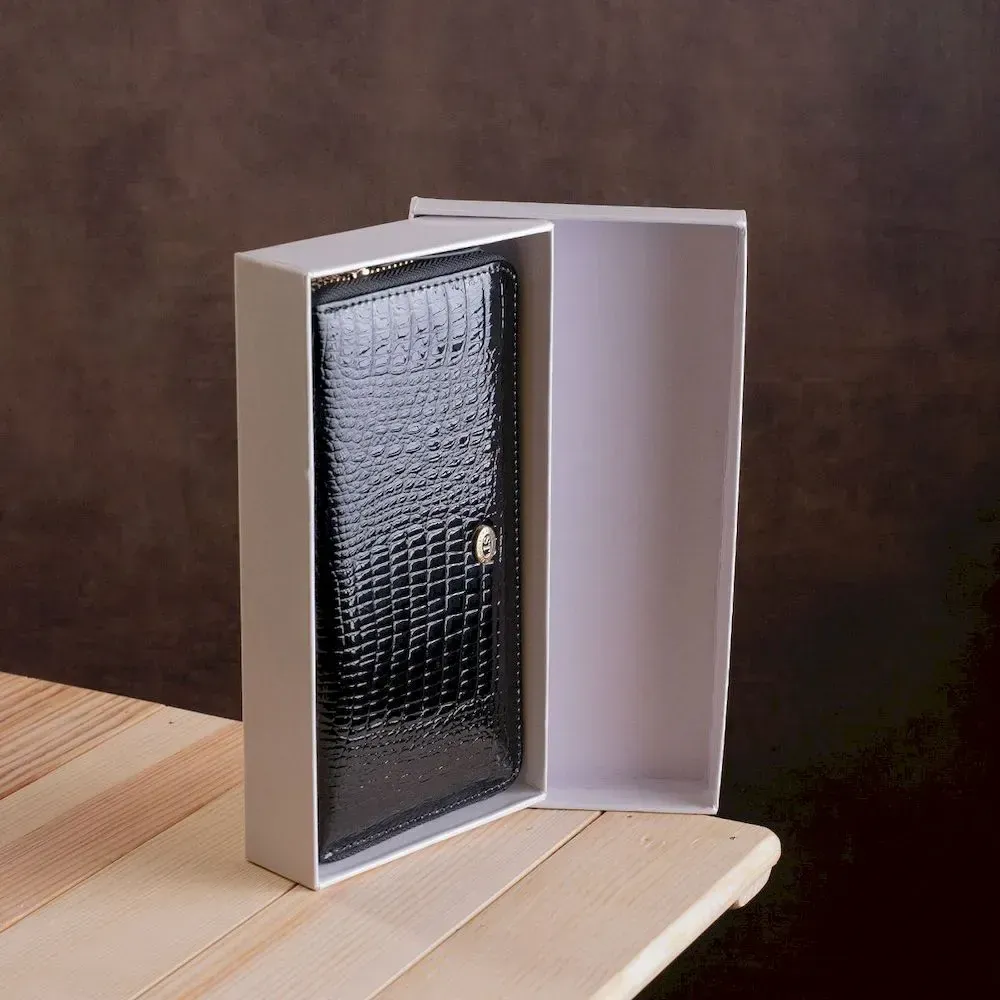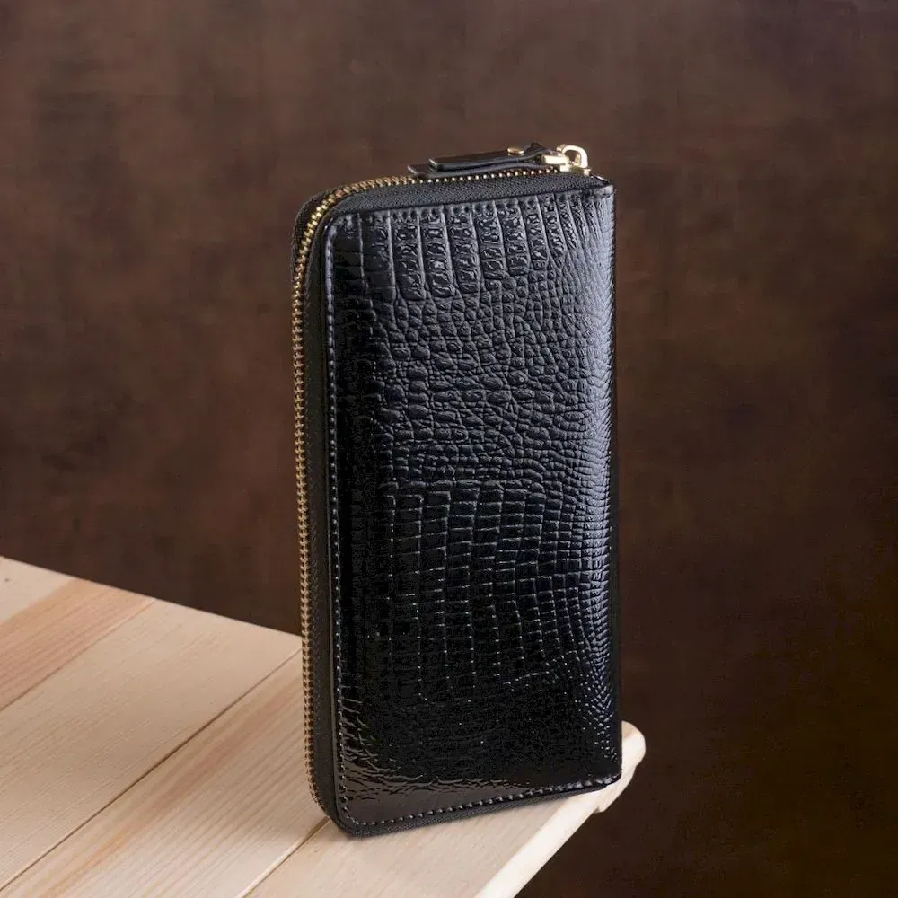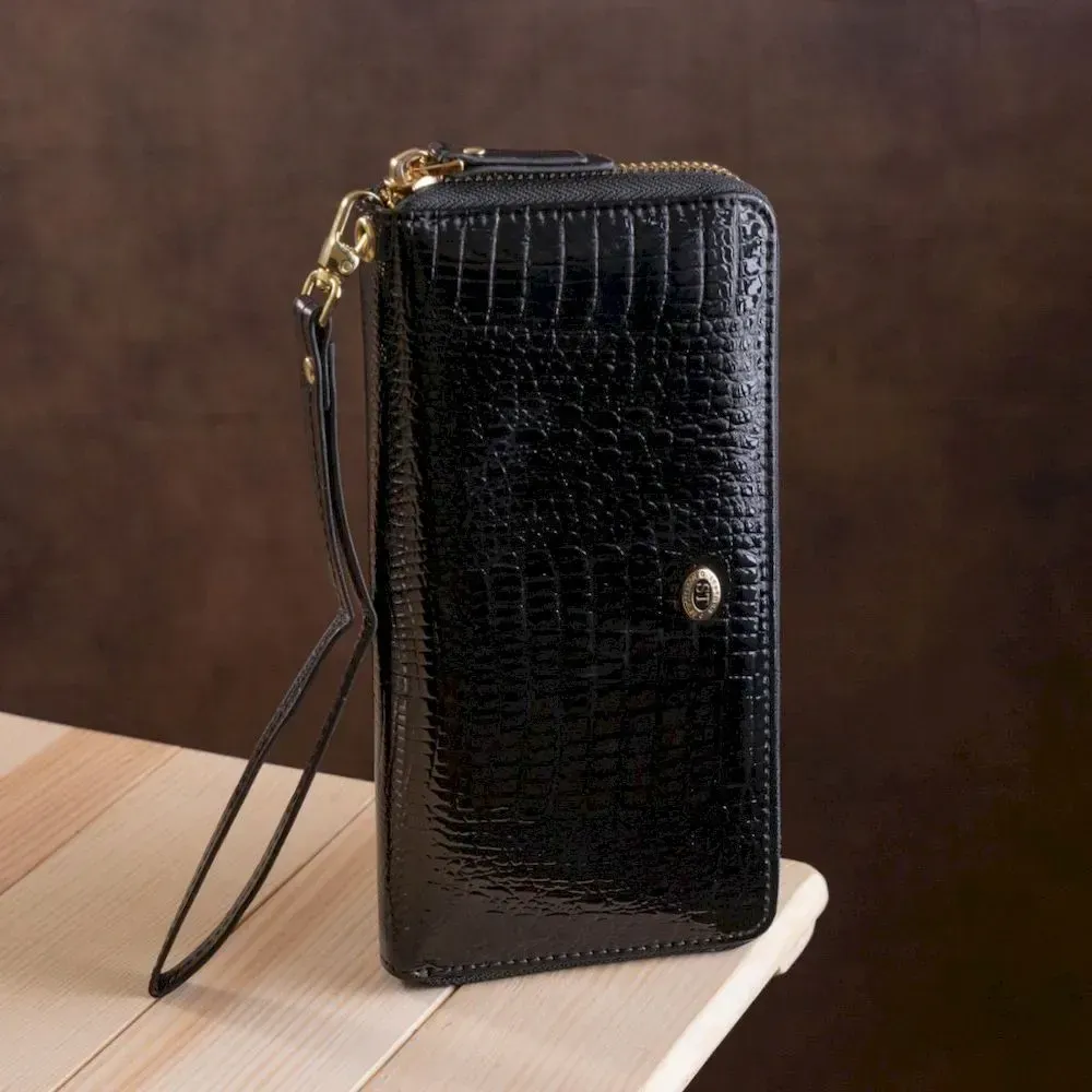 Дана модель гаманця має невеликі габарити, виконана з натуральної , міцної, зносостійкої та якісної шкіри в чорному кольорі. Комплектація відділень стандартна та досить функціональна: відсіки для паперових купюр, прилеглі кишені та вирізи під платіжні картки з монетницею. Спереду нанесений фірмовий логотип та красивий візерунок під крокодиллю шкіри. Додатково порадує також ремінець на зап'ястя та надійна металева блискавка, яка чудово закриває гаманець, а завдяки фірмовій коробці аксесуар прекрасно підійде в ролі подарунка.